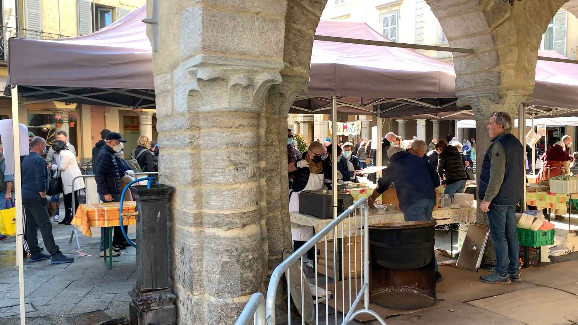 DOMODOSSOLA-43-10-2021-- Tanta voglia di normalità e socialità a Domodossola come dimostra la grande affluenza alla Festa d'Autunno in programma per tutta la domenica su iniziativa dell'associazione Oscella Felix. In tantissimi in piazza Mercato per la distribuzione di polenta e spezzatino, salamini e gorgonzola. Dalle 14 si potranno degustare gli stinchett, ed alle 15 le castagne con il vin brulè.