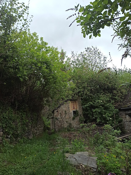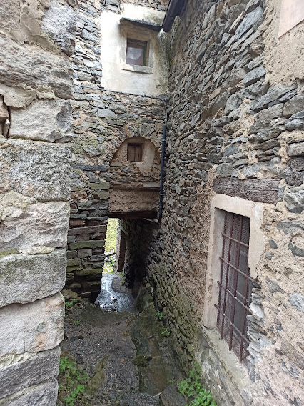 Al primo tornante attraversiamo un prato per portarci sulla bella mulattiera che sale dal centro e così, saggezza a parte, siamo subito a bagno. Gli scarponi “da neve” non pensavamo servissero sui sentieri di Crevoladossola, ma avevamo fatto i conti senza la guida. Arriviamo a Ternaro, passiamo Borgo dell’Era e ci fermiamo brevemente all’Oratorio dei Santissimi Carlo, Rocco e Sebastiano a Pinone. Adesso non piove.
