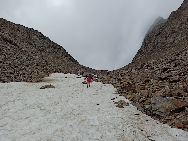 Ci aiutano un paio di nevai sui quali si cammina decisamente meglio. Gli amici e la saggia guida si adattano pazientemente al mio passo da “vaca vegia”, come direbbe l’ex alpinista acciaccato, oggi assente. Pago a caro prezzo gli ozi della vacanza al mare. Il gruppo in mia assenza si è fatto due giterelle da quasi 1500 metri di dislivello e la differenza di prestazioni, che già prima era evidente, si è ulteriormente accentuata.