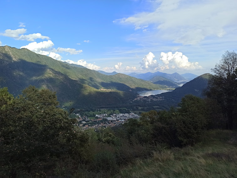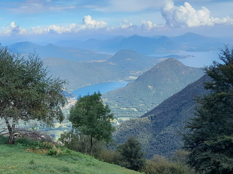 Più che alpe la chiamerei borgo di Frasmatta. E lo stesso vale per Schirombey, 1162, che raggiungiamo dopo meno di tre quarti d’ora. Intanto ci accompagna il sole che crea scorci stupendi, insieme a nuvole e nebbie, verso i laghi. Qui invertiamo la rotta a nord ed arriviamo alla Capanna Legnano, 1287, dove il meraviglioso panorama merita una breve pausa.