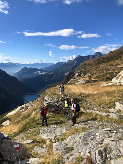 Al Lago di Poiala o Beyelesee, 2305, il sole ci abbandona e soffia un venticello fresco. I più freddolosi, dopo mesi di saune alpine, apprezzano nuovamente il piacere di camminare in montagna con giaccavento, guanti e berretto. Costeggiamo il meraviglioso specchio d’acqua e raggiungiamo il Passo, anche lui “di Poiala” o Hinnerlecka, 2411, Cima Coppi di oggi (un’ora e mezza).