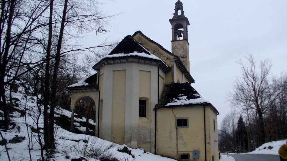 Al lavatoio presso la chiesa di San Giovanni Battista, che è ormai il nostro consueto punto di sosta, facciamo colazione. Poco sopra il paese arriviamo alla Cappella di Cimavalle, 754. Con tutta calma iniziamo la discesa. In fondo al rettilineo che esce dalle case della frazione imbocchiamo sulla destra il sentiero che, più in basso, attraversa la strada che scende a Nava e alla frazione centrale, Chiesa. Passiamo da Piccioledo, dove si trova la Cappella della Madonna delle Grazie, e proseguiamo nel bosco fino a Chiesa.