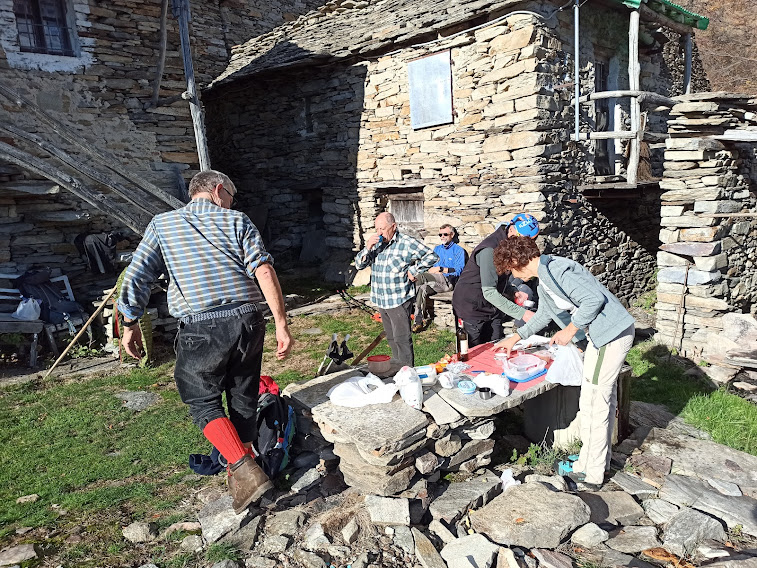 Fra Doaglia e Onunchio abbiamo camminato sul confine o all’interno del Parco Nazionale della Valgrande. Dopo una visita dell’alpe ci sistemiamo comodamente vicino alla fontana e festeggiamo il compleanno della forte signora che è sempre con noi, ormai insostituibile badante.