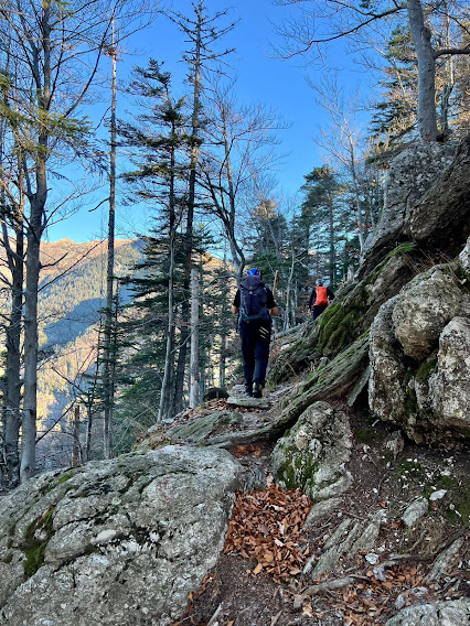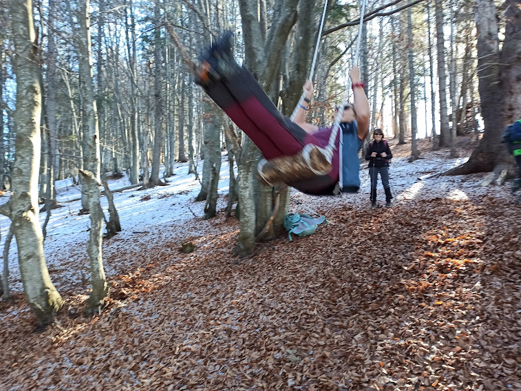 Ci scaldiamo con il primo sole e con il primo tratto del percorso abbastanza ripido nel bosco di faggi, con le solite foglie che ormai da qualche mese ci accompagnano, mettendo a dura prova il nostro equilibrio.