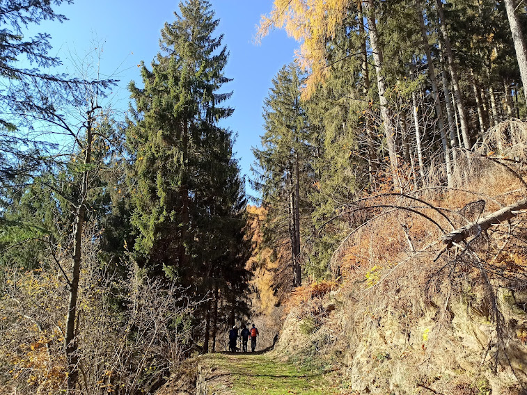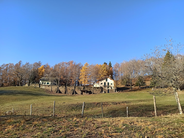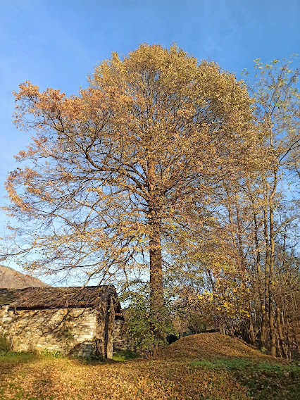 Non proseguiamo in piano verso l’Alpe Cavallotti, ma scendiamo direttamente a Cappella Fina, 1102, dove approfittiamo di tavoli e panche per mangiare e brindare all’ultimo sole (un’ora e un quarto). Ci muoviamo quando si nasconde dietro gli alberi, nel suo lento ma inesorabile cammino verso occidente.