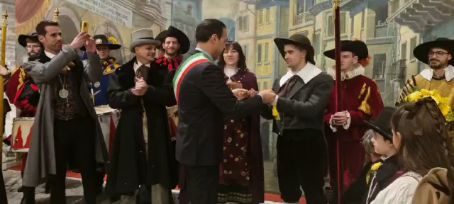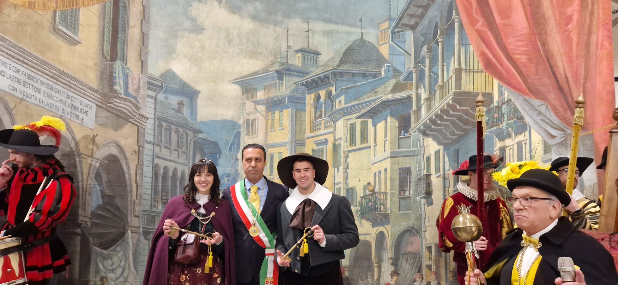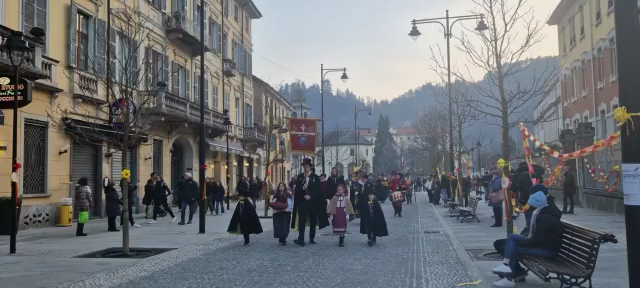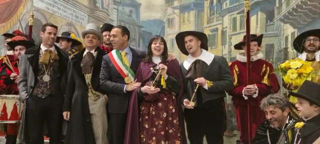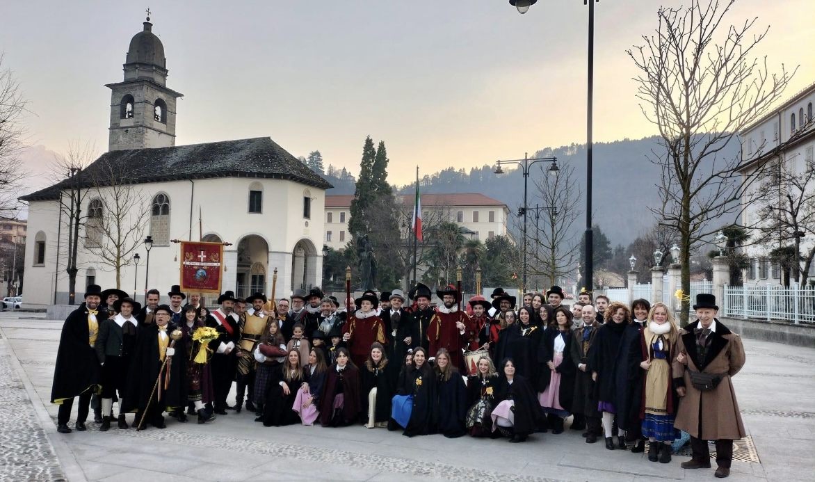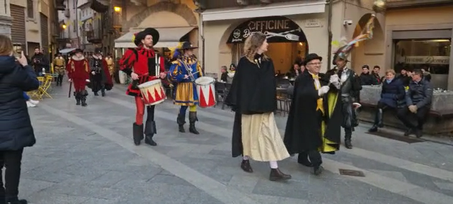 DOMODOSSOLA- 11-02-2023-- Al via il Carnevale di Domodossola: oggi lungo le vie del centro, la corte di Mattarella ha accompagnato il Togn e la Cia, a suon di tamburi, sino a Palazzo San Francesco dove si è tenuta la tradizionale consegna delle chiavi della Città.