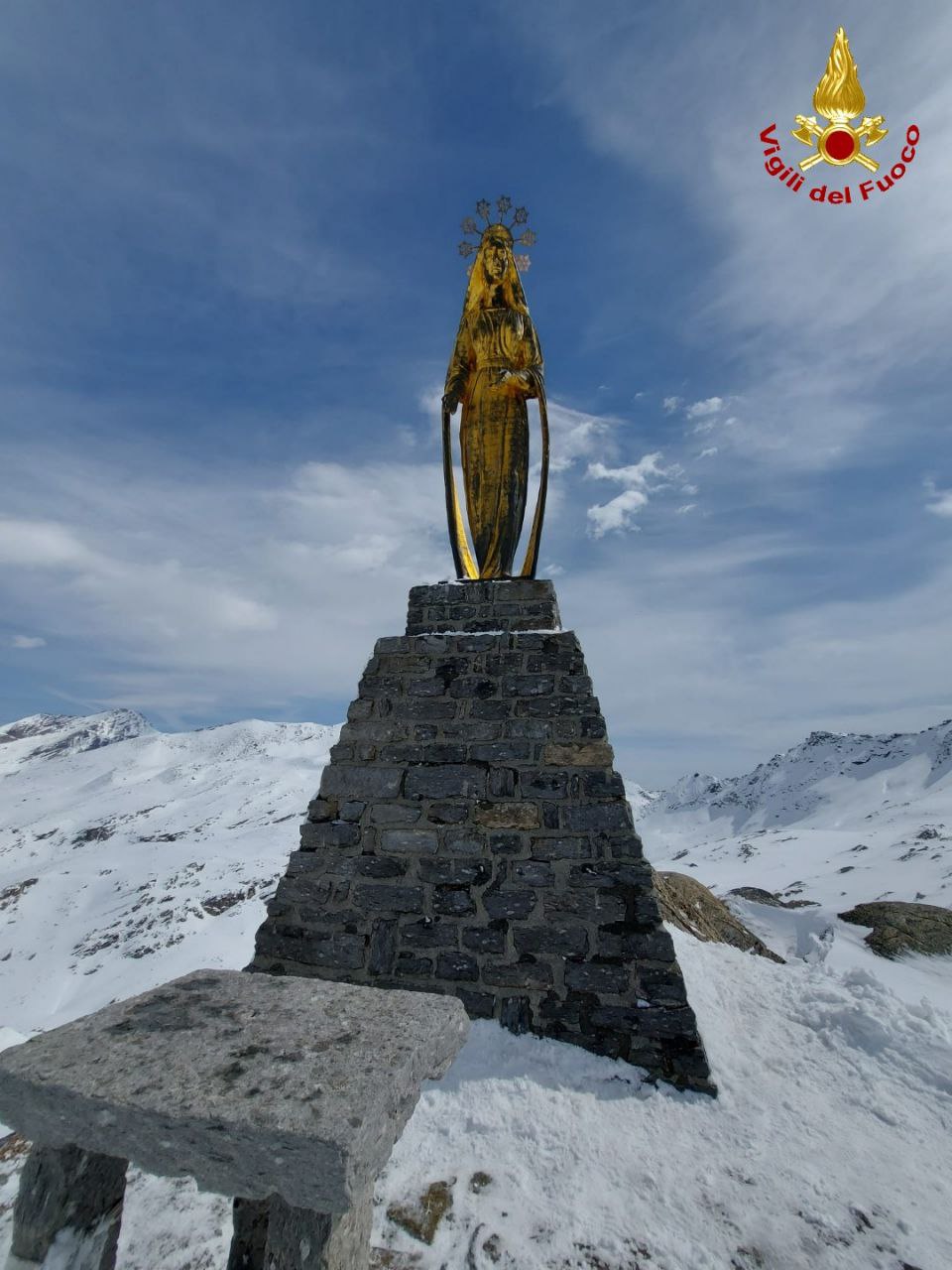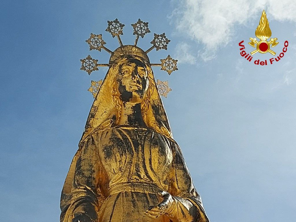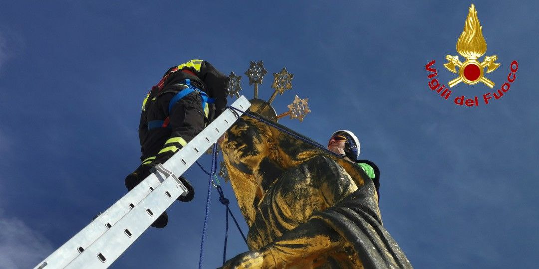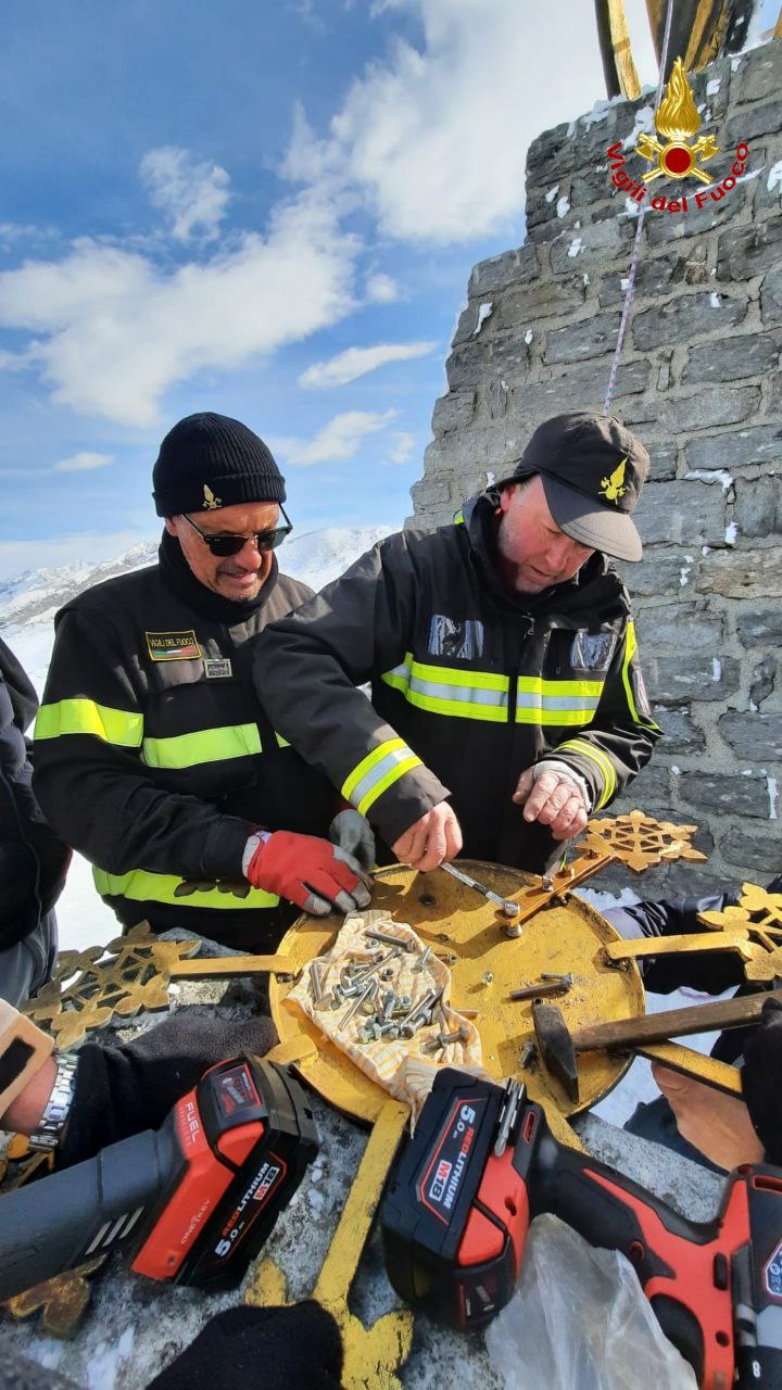 MACUGNAGA- 22-04-2023-- Grazie alla collaborazione del personale del Comando Vigili del Fuoco , sabato 22 aprile, è stata riposizionata, dopo oltre un ventennio, la stella mancante sulla corona della statua della Madonna della Neve al Monte Moro.