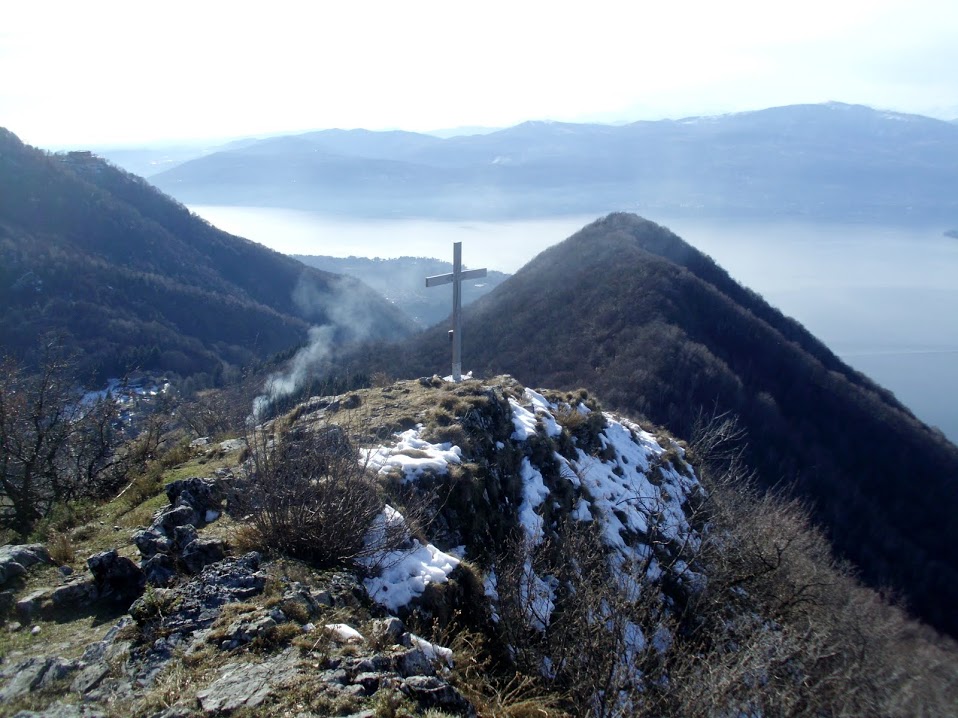 Con saliscendi si percorre il filo di cresta fra Lago Maggiore e Valcuvia, su neve ben portante ed estasiati da panorami stupendi a trecentosessanta gradi, raggiungendo l'ultimo rilievo dei Pizzoni, quota 1050. Una croce d'acciaio con libro di vetta incorporato segna l'inizio della ripida discesa.