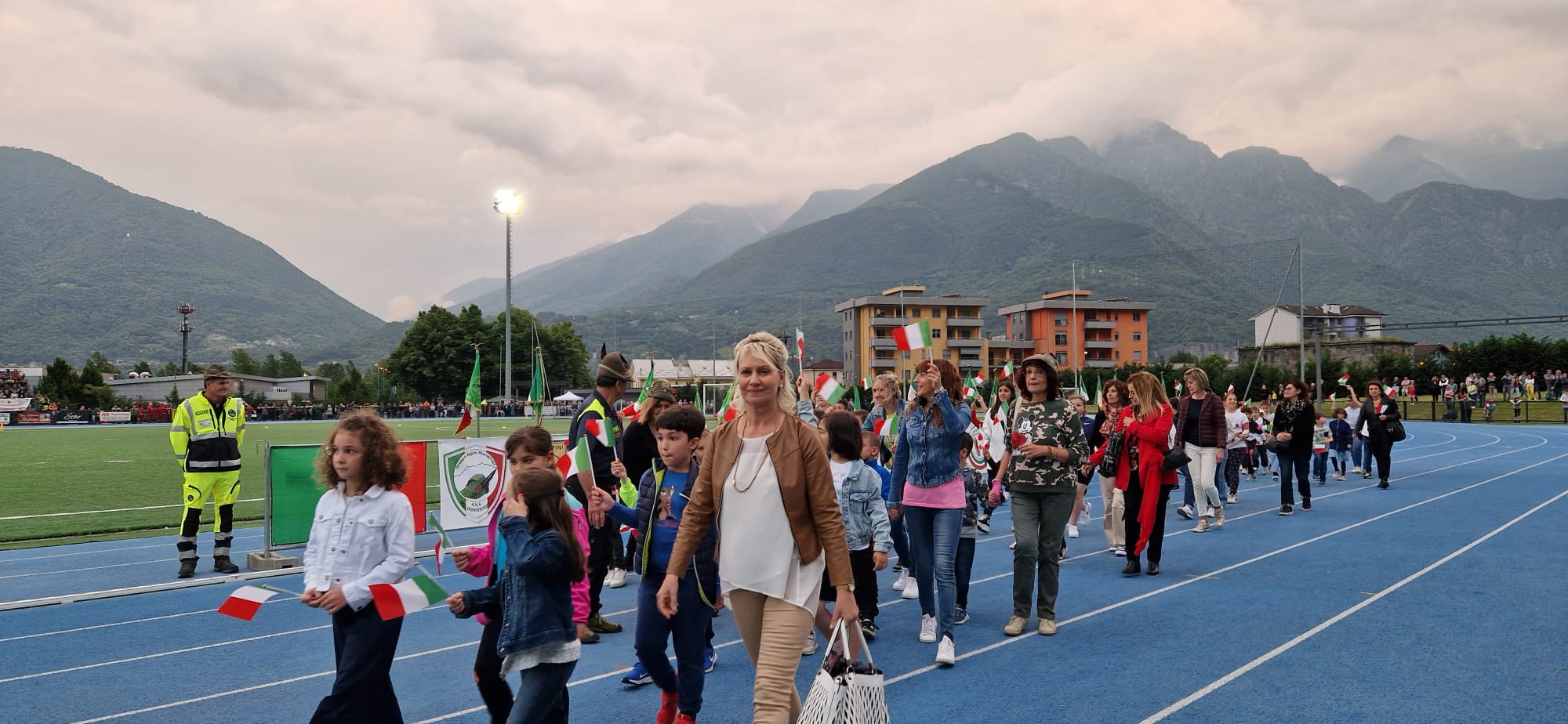 Alla manifestazione hanno partecipato le Scuole Kennedy di Domodossola: i bambini in formazione hanno sfilato sulla pista di atletica dello stadio e hanno presentato lavori artistici dedicati agli Alpini.