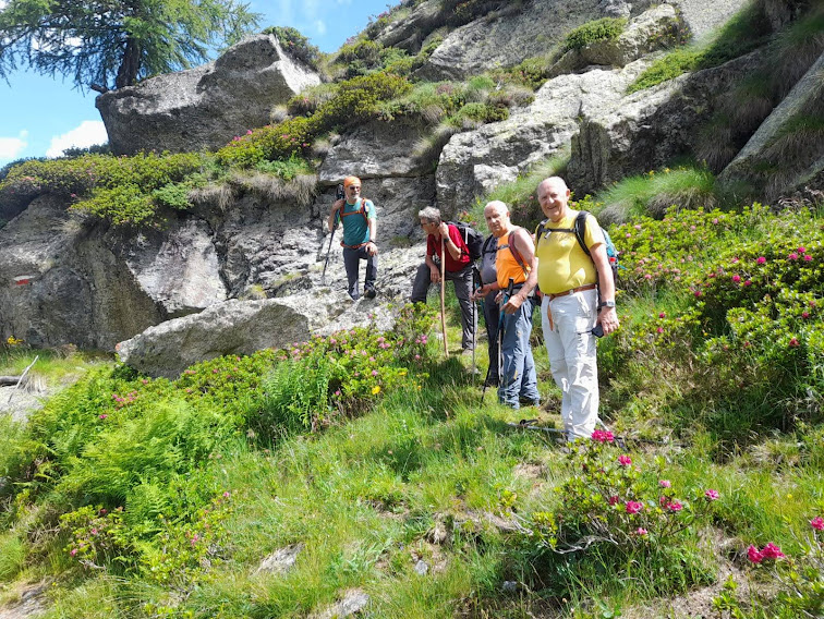 CEPPO MORELLI- 16-07-2023-- Due anni fa un quartetto di Murmäta, del quale facevo parte, era salito al Passo del Tignaga dalla valle omonima ed era sceso sul versante dei bellissimi alpeggi di Girareccio e Laveggio. Quest’anno sono tornati sullo stesso percorso tre amici che non lo conoscevano, accompagnati dalla indispensabile badante e da un esperto che già era salito di lì. Io, insieme ad un ex alpinista sempre giù d’allenamento e a due amici al rientro dopo mesi difficili, sono andato incontro a loro da Girareccio.
