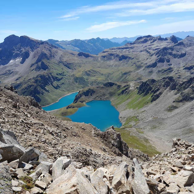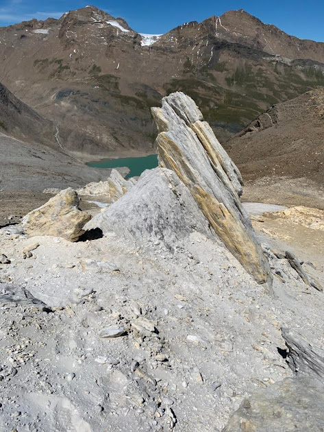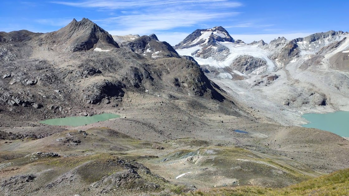 Degli amici non c’è ancora traccia, ma è presto. Qui inizia il bel sentiero G37, inaugurato pochi anni fa, che collega con il Rifugio Eugenio Margaroli all’Alpe Vannino. Bello ma eterno, come mi racconteranno poi gli amici. Grazie al mio passo tranquillo sto bene e proseguo. Dopo tre quarti d’ora, intervallati da una veloce pausa pranzo, arrivo su un pianoro a quota 2750 da cui si domina, un centinaio di metri più in basso, il Lago di Ban Occidentale, 2618. A destra la coda del grande Lago del Sabbione. Verso sud un vasto e bellissimo paesaggio quasi lunare, per me del tutto nuovo, dal quale dovrei veder arrivare la squadra scelta di Murmäta proveniente dalle Guglie Bianche del Lebendum. Vedo altri in lontananza, ma non i sette del gruppo.