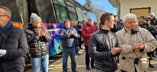OSSOLA- 25-11-2023-- Un treno speciale è partito dalla stazione della Vigezzina a Domodossola questa mattina alle 8.54 ed è salito fino a S.M.Maggiore con a bordo le autorità. Si tratta del clou delle celebrazioni per il centenario di fondazione della Ferrovia Vigezzina. La prima parte ufficiale delle celebrazioni si è svolta presso la stazione di Santa Maria Maggiore.