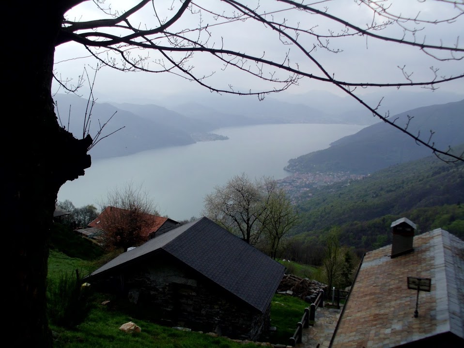 Oggi siamo in sette, con tre rappresentanti dell'INPS ossolana e due dell'INPS verbanese. Due del gruppo, invece, sono ancora in attività, per consentire la nostra sopravvivenza. Poco dopo Cannobio, in direzione Locarno, si imbocca la strada che porta a Sant'Agata, quota 490, bel paese che domina il Lago. Qui posteggiamo e in breve raggiungiamo Cinzago, 501, con il suo caratteristico campanile a sezione triangolare. Nuvole, che più in alto si trasformeranno in nebbie vaganti, mantengono fresca l'aria. Si prosegue, in falsopiano, fino alla chiesa di San Bartolomeo in Montibus, del dodicesimo secolo, immersa in un meraviglioso castagneto, 523 (mezz'ora). Si incomincia a salire seriamente ed arriviamo all'Alpe Pizzocca, 714. Più sopra ecco il grande e ripido prato dell'Alpe L'Agher (mezz'ora). Siamo intorno a quota 1000. C'è un agriturismo e il panorama sul Lago Maggiore è speciale: più si sale, più si estende, più ci lascia a bocca aperta. Contemplandolo, dedichiamo più tempo del solito alla colazione.