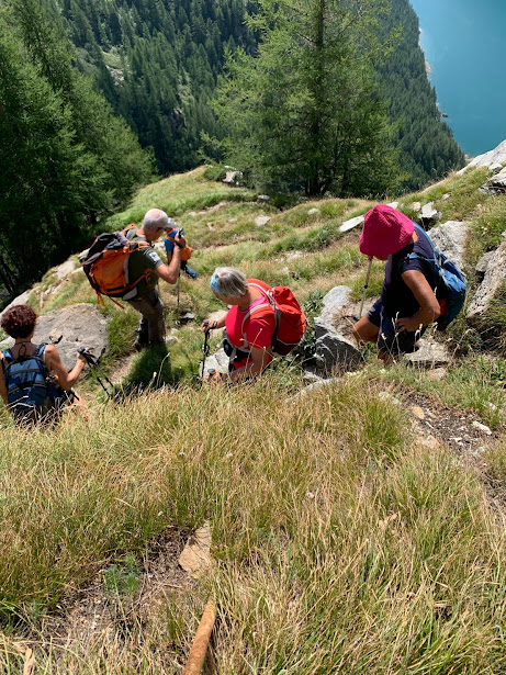 Visita turistica di chi da queste parti non è mai stato e, sempre lungo H08, ripida discesa all’Alpe Spygher, in riva al lago, 1600 circa. L’ottimo formaggio che acquistiamo mi ricorda il più nobile Bettelmatt. Lungo la sponda occidentale del lago e la lunga galleria torniamo alle auto (tre ore dalla Bocchetta di Scarpia). Che meraviglia oggi!
