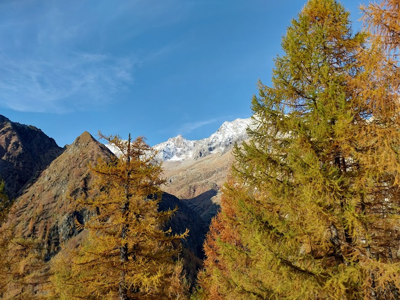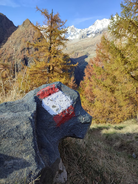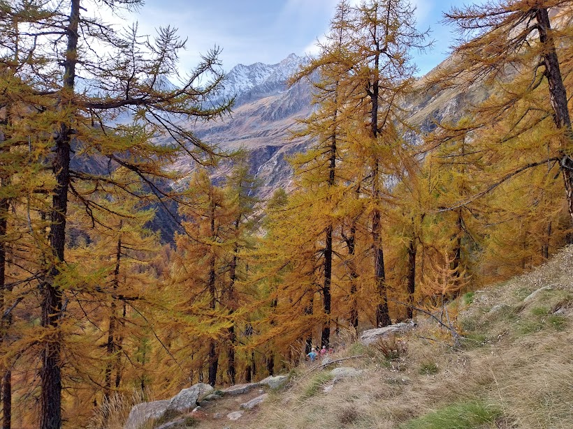 Il sentiero pianeggiante permette di godersi i primi panorami su Andolla e Weissmies che, salendo, si allargheranno sempre più, in un mix di pura bellezza abbinata agli splendidi colori dell’autunno. Dopo un’ora di cammino ecco l’Alpe Teste Inferiore, 1750 circa. Qui, con un piccolo aiuto dell’uomo, un sasso è stato trasformato nella testa di un cane, direi di razza San Bernardo, con la guancia destra decorata dal segno bianco e rosso del sentiero C26a. Breve pausa e si riprende a salire seriamente.