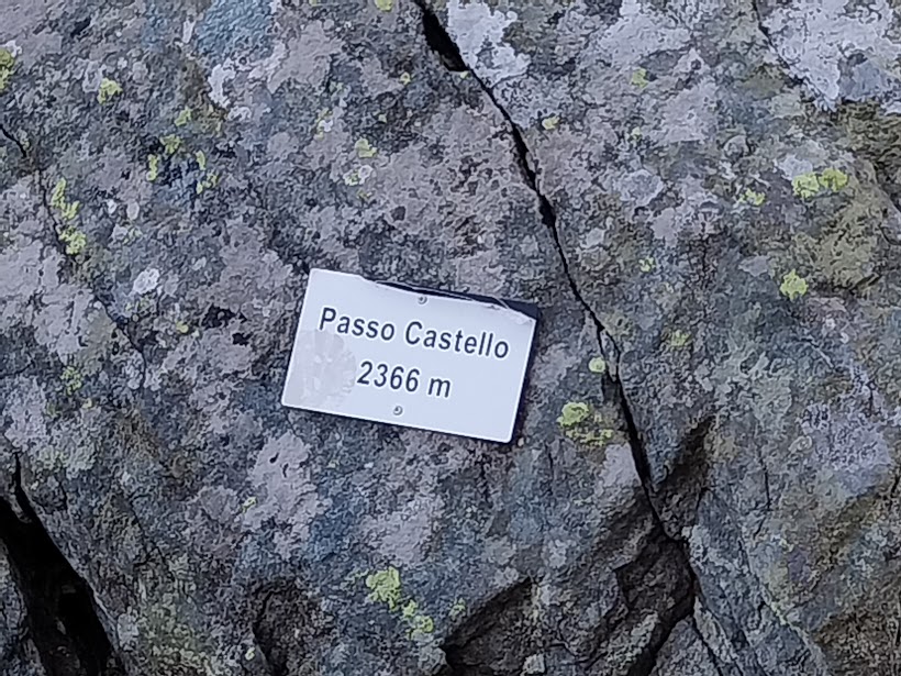 L’orario e la bella giornata ci ispirano a proseguire verso lo spettacolare Passo Castello, “traversando” verso sud est in leggera salita, adesso sul sentiero C26, un po’ più impegnativo (un’ora e un quarto). Questo passo, visto da lontano, assomiglia a un vero e proprio castello medievale, con le sue torri. Siamo in una strettoia fra due pareti verticali, che un cartello indica 2366, ma, se tutti i nostri altimetri appena tarati non sono “made in china”, l’altezza giusta è circa 2415.