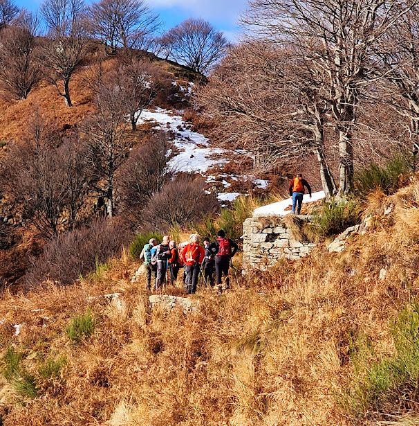 Prima del bivio per l’Alpe Morissolo ci fermiamo per una parca colazione, in previsione delle libagioni che ci attendono. Qui sale, non indicata, una traccia sulla sinistra, in mezzo alla vegetazione fortunatamente quasi invernale, su quella che sarebbe una bellissima mulattiera della Linea Cadorna. Un altro Paradiso perduto nel nostro territorio, ahimè! Sui cartelli indicatori qui si risparmia decisamente. Qualche tornante in mezzo alle felci ingiallite e, sulla dorsale, invertiamo decisamente la rotta verso ovest e poi sud. In dolce salita, pestando gli ultimi residui di neve, arriviamo in vetta al Monte Morissolino, 1410, dopo un’ora e tre quarti dal campo base di Calpera.
