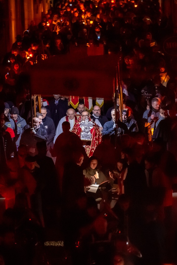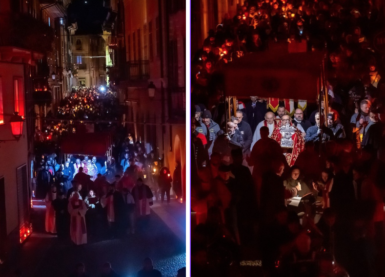 Al termine della messa, la reliquia è stata calata per il tradizionale bacio dei fedeli e portata in processione verso il santuario, dove rimarrà fino al pomeriggio odierno. La celebrazione proseguirà oggi alle 10:30 con la messa officiata da don Francesco Mancinelli, rettore del santuario di Crea.