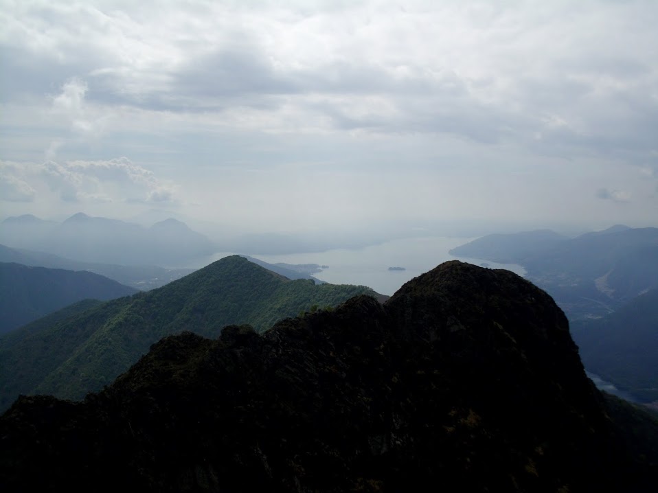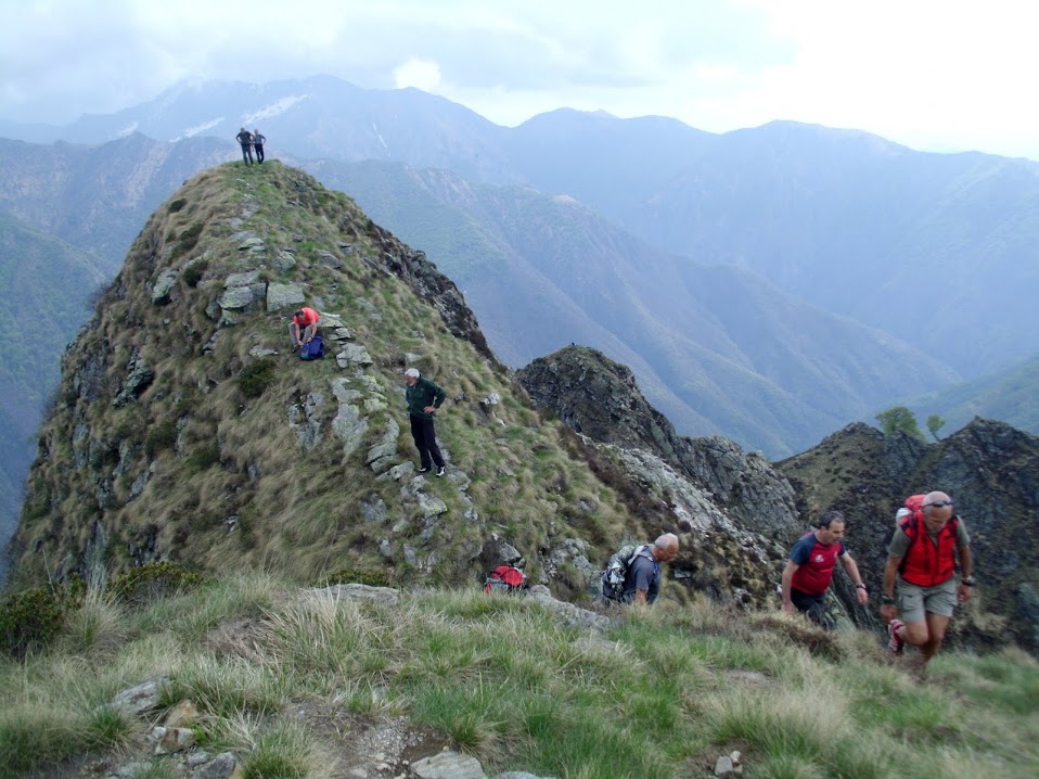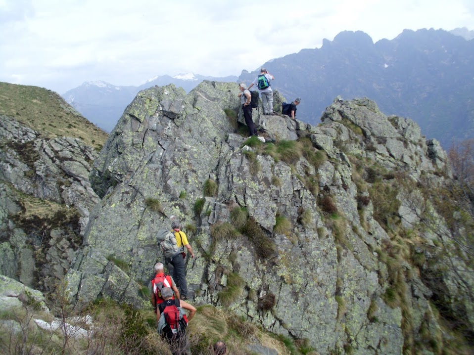 Alcuni escursionisti, nonostante la disapprovazione sacrosanta delle guide, abbandonano gli zaini lungo il percorso per ridurre la fatica. Penultima ripida salita sul pratone detto Pasquetta e qui lasciamo le racchette che ci intralcerebbero. Ripidissima discesa su sentiero un po' esposto, traverso attrezzato e ultima salita, sempre attrezzata. Siamo in vetta, 1574, dopo un’ora e tre quarti dalla Colma di Vercio. Pietose borracce di chi ha ancora lo zaino soccorrono chi ha le spalle colpevolmente scariche, ma che sia l'ultima volta! Panorama stupendo su laghi, Ossola, Val Grande ed altro.