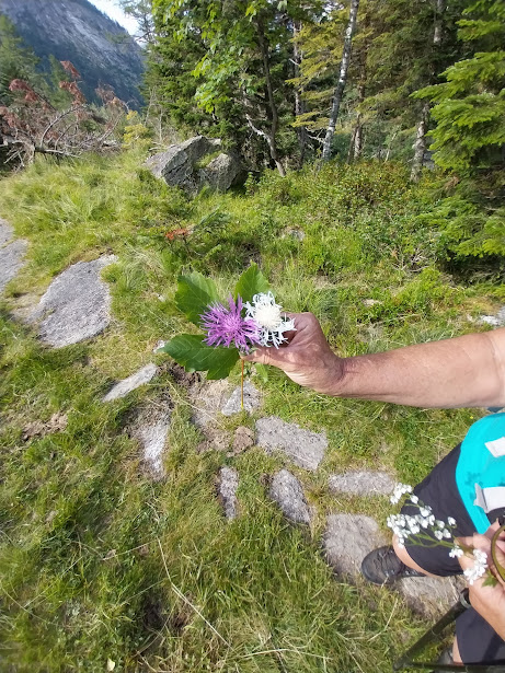 A quota 2350 mi incontro con i conquistatori del Turlo e scendiamo insieme al bivacco. Loro hanno impiegato un'ora e tre quarti per salire al Colle, calpestando anche un po’ di neve e lasciando i temporali in Valsesia, e un'ora e mezza per la discesa al Ratuligher. Il ritorno a Isella, lungo il percorso di salita, dura ancora tre ore. Una badante ha ancora la lucidità necessaria per riconoscere un raro esemplare di fiordaliso albino, probabilmente impallidito bruscamente nel vedere lo scempio della sua meravigliosa valle, a pochi passi dal suo prato natio.