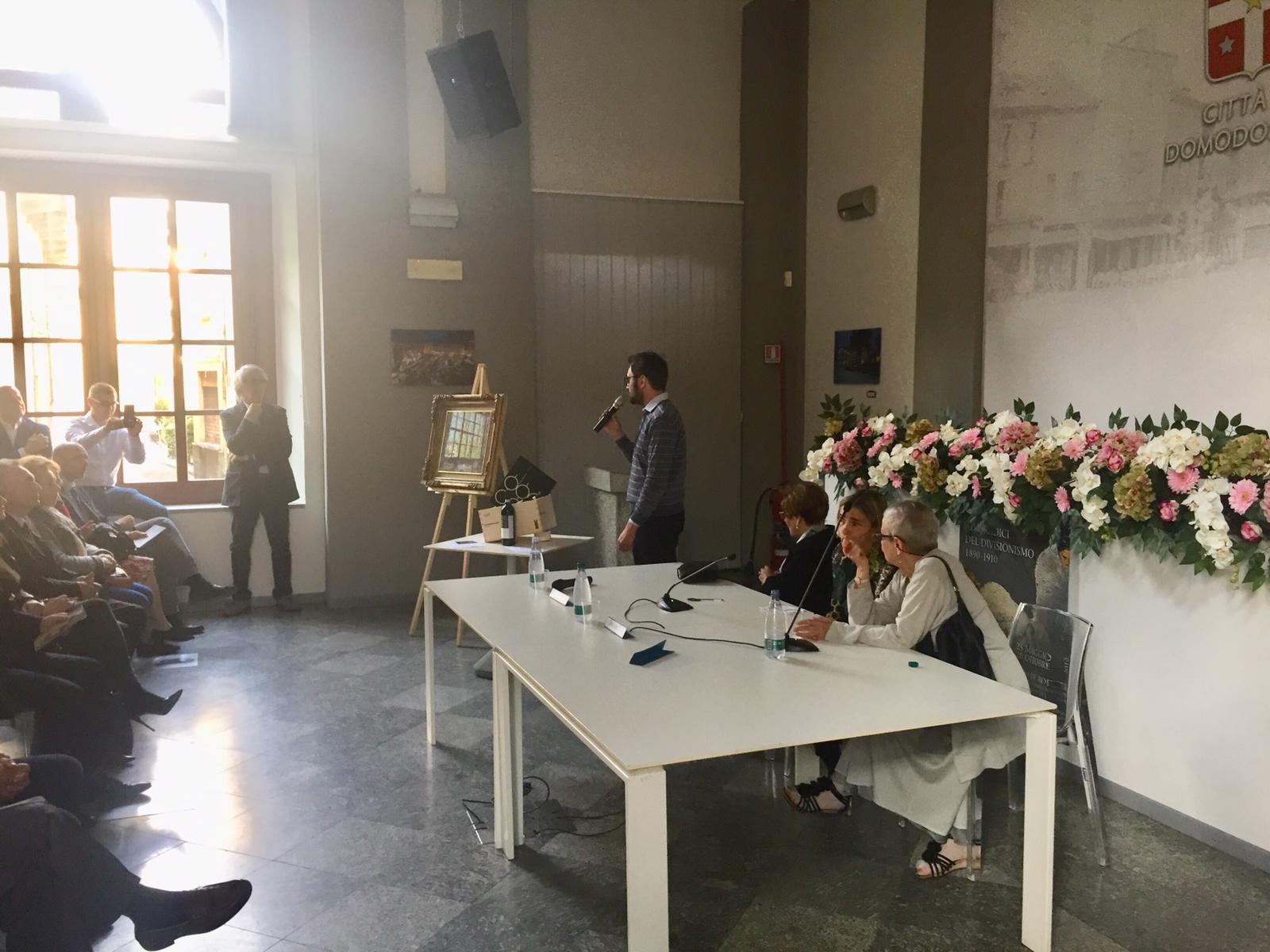 1890-1910" è la mostra inaugurata oggi pomeriggio a Casa De Rodis , che celebra il grande maestro vigezzino nel cinquantesimo dalla sua morte e si potrà visitare fino al 20 ottobre 2019. L'inaugurazione è stata preceduta in Cappella Mellerio dalla presentazione della mostra da parte di Paola Poscio, della figlia Stella Poscio e della curatrice Anne Paul Quinsac. La mostra promossa da Collezione Poscio in collaborazione con AsiloBianco e sostenuta da Compagnia di San Paolo e Fondazione Comunitaria del Vco presenta gli esiti più alti e innovativi della pittura di Carlo Fornara: nei due decenni tra Ottocento e Novecento, trentacinque dipinti ad olio e sedici disegni delineano l'intenso percorso creativo dell'artista, dalla formazione vigezzina sotto la guida del geniale maestro Enrico Cavalli, fino all'incontro con Giovanni Segantini e alla sperimentazione divisionista con l'elaborazione di un linguaggio e di una tecnica personale capace di raffigurare sulla tela la poesia e insieme la forza stessa della natura. Tra le opere esposte anche un quadro ritrovato pochi giorni fa dalla Polizia perché sottratto nel 2004 alla famiglia Poscio durante un furto. Si tratta dell'olio su tela intitolato " La sorella Marietta davanti alla chiesetta del Lazzaretto a Prestinone". Nelle opere in mostra compare spesso l'amata Valle dei Pittori ma il quadro " L'aquilone" con la sua visione panica della natura, si può definire un tributo al maestro Segantini. Ad un' opera del Fornara le cantine Garrone hanno dedicato un'etichetta d'autore sulle bottiglie del Prunent. Marco Garrone ha presentato l'etichetta tratta dal quadro " Dalla vetrina del mio studio" che rappresenta la vista dello studio del pittore a Prestinone. Inoltre è stato presentato il progetto " Carnet de Voyage" nato dalla collaborazione con l' associazione Asilo Bianco creata dall'artista Enrica Borghi. Scopo del progetto far rivivere oggi un'esperienza del fare arte legata al territorio così come l' ha vissuta Fornara cento anni fa.