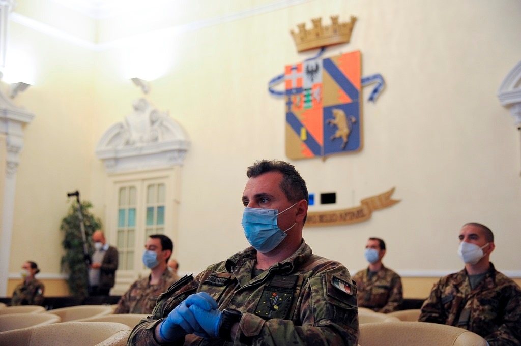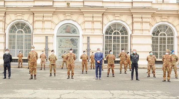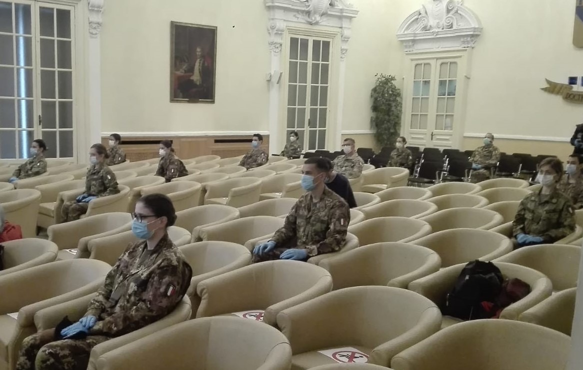 in ferma annuale del Corpo sanitario dell’Esercito e dell’Aeronautica Militare destinati alle Residenze sanitarie assistenziali (Rsa) del Piemonte, sono stati accolti questa mattina nell’aula magna del Comando per la Formazione e Scuola di Applicazione dell’Esercito, a Torino, dal generale di Divisione Salvatore Cuoci, comandante dell’Istituto di formazione, dal commissario straordinario per l’emergenza Covid-19 Vincenzo Coccolo e dall’assessore alla Sanità della Regione Piemonte, Luigi Genesio Icardi, alla presenza del comandante della Brigata alpina Taurinense generale Davide Scalabrin, e del colonnello Fabio Zanichelli in rappresentanza dell’Aeronautica Militare.