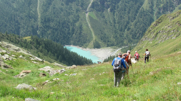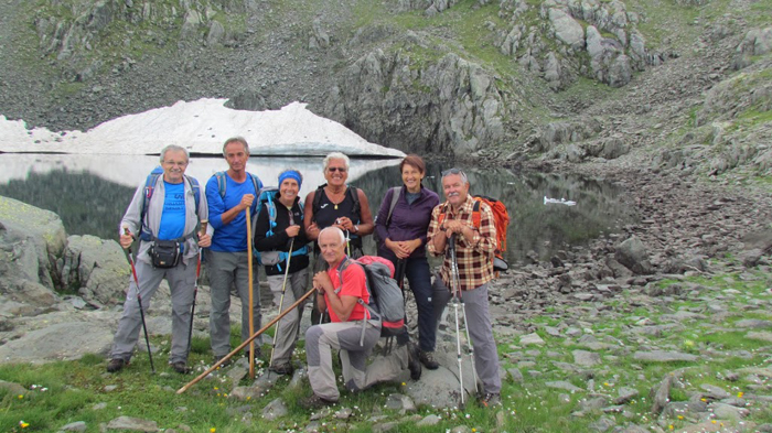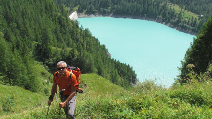 Bella giornata. Due forti signore accompagnano cinque anziani ed un giovanotto in odore di pensione. Una delle signore rientra in gruppo dopo una dura estate di lavoro in Sardegna. Sono due le guide, indigene o quasi. Parcheggiamo in prossimità della diga di Cheggio, 1497, e c’inerpichiamo subito lungo il sentiero che sale a destra. Il pendio è inizialmente ripido. Al primo bivio teniamo la sinistra e la pendenza si attenua. Stiamo costeggiando, qualche centinaio di metri più in alto, la sponda nord-orientale del grande lago. Primi bellissimi scorci su Weissmies e Andolla. Raggiungiamo, alla fine del lungo traverso, un bellissimo cane di sasso, direi di razza San Bernardo, con la guancia destra decorata dal segno bianco e rosso del sentiero C26A. Siamo a quota 1800 circa, all’Alpe Teste Inferiore (un’ora). Di qui si torna a salire in modo serio e si arriva ai ruderi dell’Alpe Teste Superiore, 2001, come indica un cartello. Ci concediamo una breve colazione. Riprendiamo a salire e, dopo un’ora e mezzo circa, siamo al Passo della Preia, 2327, che domina anche l’alta Val Bognanco. Più sotto delle splendide stelle alpine, solo fotografate ovviamente, ci confermavano che qui, fortunatamente, il transito dell’homo sapiens non è frequente. Proseguiamo sulla destra, attraversando in leggera salita e, in breve, arriviamo al Passo Castello, 2366, la Cima Coppi di oggi. E’ uno stretto valico fra due alte pareti rocciose, bellissimo. Facciamo acrobazie per una meritata foto di gruppo. Lungo un canale erboso abbastanza ripido scendiamo un centinaio di metri, per poi attraversare verso destra e risalire dolcemente alla Bocchetta dei Pianei, 2325. Leggera discesa e, deviando a sinistra, risaliamo con percorso libero al Lago di Pianei Superiore, 2352, che ha ancora qualche residuo di valanga sulla sponda opposta ed è dominato dal Pizzo Montalto (un’ora). Qui, dopo le discese ardite e le risalite, come cantava il grande Lucio, ci fermiamo a rifocillarci: non si salirà più. La pausa è breve e ci abbassiamo a riprendere il sentiero principale C26 che scende dalla Bocchetta dei Pianei all’Alpe Pianei, 2179. Dop tre quarti d’ora siamo all’Alpe Pasquale Inferiore, 1876 (quella Superiore mi è sfuggita). Di qui proseguiamo in leggera discesa verso sinistra, lungo un tratto con catene e attraversando una valletta, fino all’Alpe Bisi, 1780. Meritata pausa e ripida discesa fino a chiudere l’anello poco più in basso. Di qui ripercorriamo fino alle auto il percorso iniziale del mattino. Una birra al bar Alpino conclude la giornata.