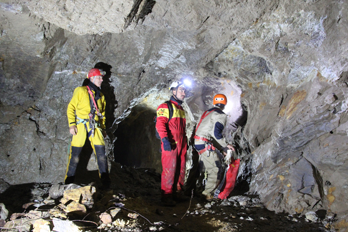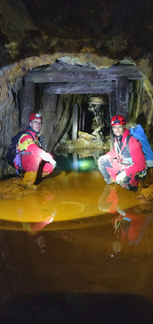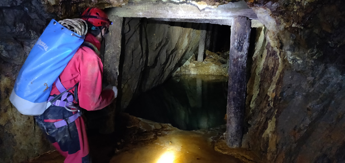 Alla nostra destra vi è una discenderia che va probabilmente ad uno scavo sul filone, oppure ad un livello sottostante a noi, che essendo completamente allagato ha formato sul passaggio questo fantastico "buco blu" di acqua purissima di una limpidezza da togliere il fiato. Possiamo infatti ammirare la galleria allagata che va verso il basso fino a che le nostre torce ci permettono di vedere.