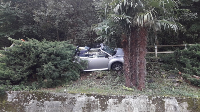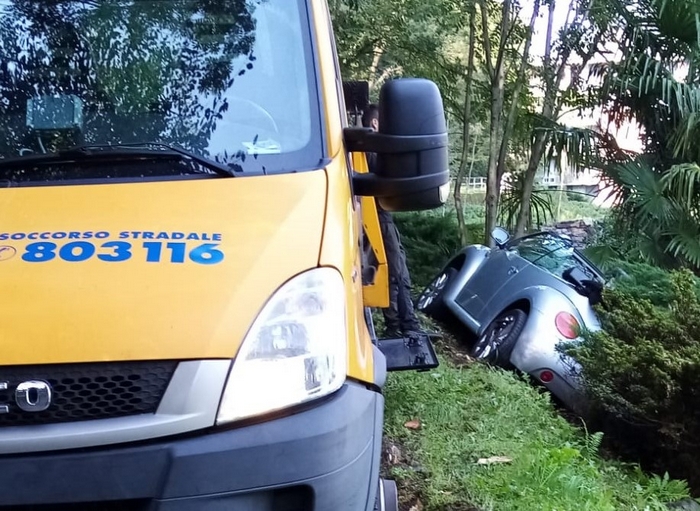 non ha più frenato ed è finito fuori strada, fermandosi contro una pianta. Non ha avuto gravi conseguenze -se non all’auto, danneggiata- l’incidente dalla dinamica spettacolare occorso stamane, attorno alle 11, a un automobilista tedesco in vacanza a Cannobio. Al volante di un Maggiolone cabriolet stava percorrendo una via laterale alla statale 34 in località Amore. Mancavano pochi metri al parcheggio che dà sulla litoranea quando ha perso il controllo dei freni. Non è riuscito a restare nella carreggiata, ha sfondato una staccionata in legno e s’è arrestato contro il tronco di una palma, senza il quale sarebbe finito nel sottostante posteggio. Per il recupero del veicolo incidentato è stato necessario, oltre al carroattrezzi, la gru che è arrivata nel primo pomeriggio.