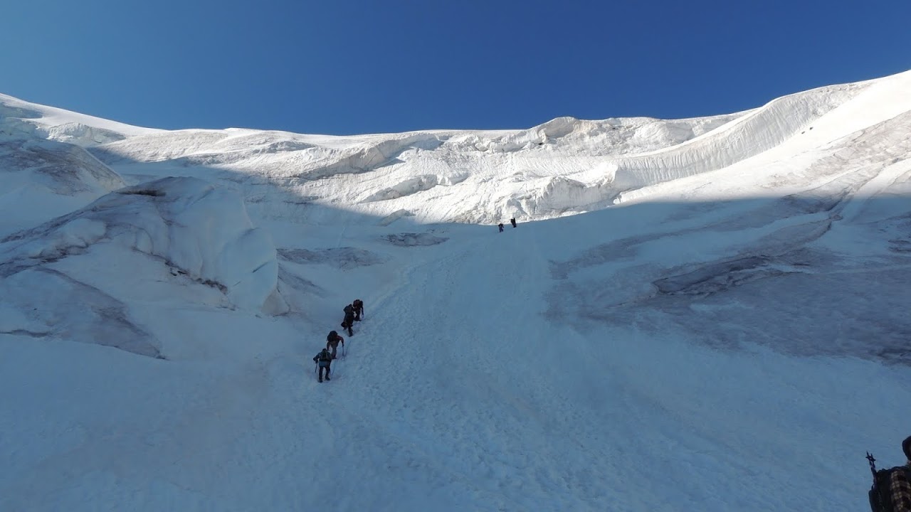 Conviene rimettersi in cammino. In meno di un’ora scendono 30 cm di neve e finalmente capisco, innalzando lodi a Giuliacci ed ai meteorologi della Confederazione, a cosa servano le famose piastre anti-zoccolo, di cui i miei ramponi non sono dotati, a differenza degli amici professionisti. Per fortuna a metà discesa smette di nevicare, torna il buonumore ed una cordata trova anche il tempo di fare un’esercitazione di sicurezza su ghiaccio nel “punto chiave”. Al campo base ci rimettiamo in sesto, tutti allegri e felici.