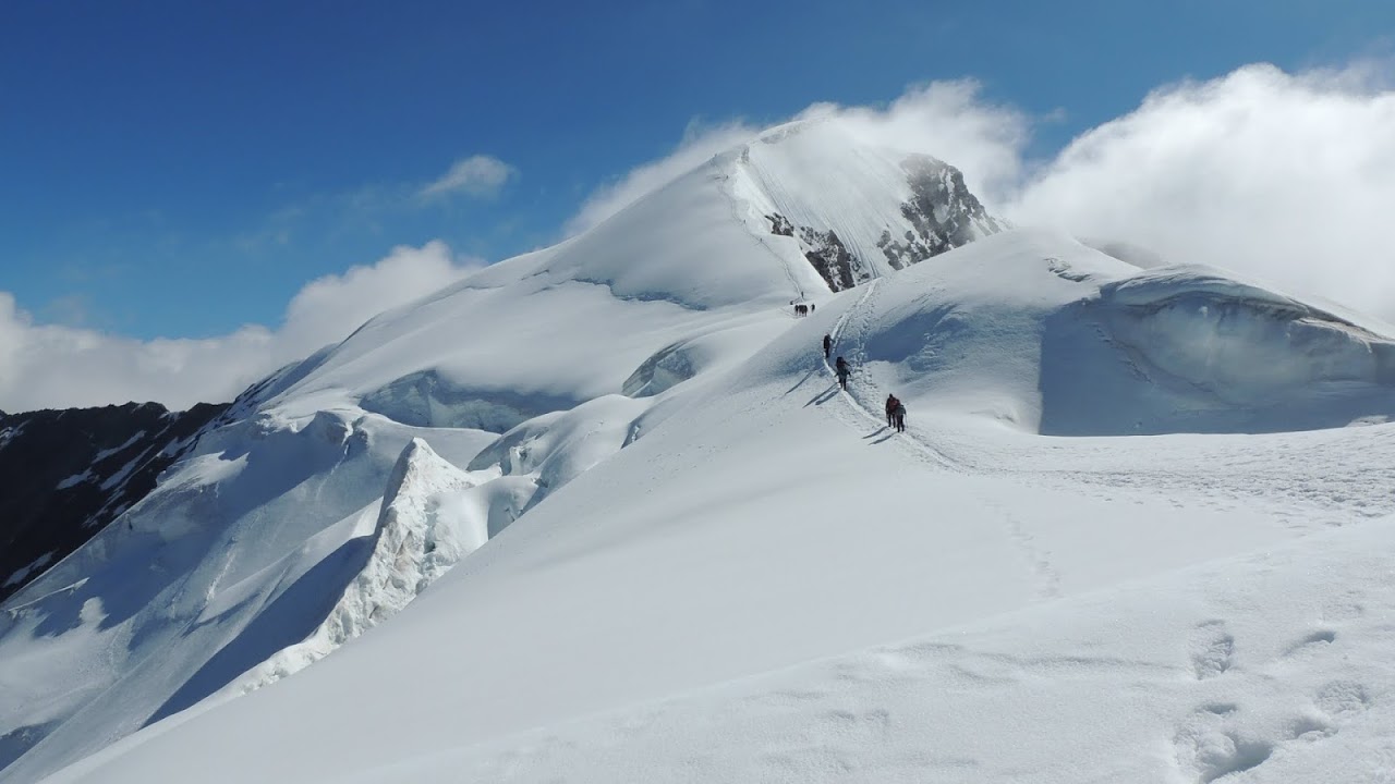 E’ meglio che faccia il passo il saggio Sergio, “numa” a parte. Giuseppino, zelante neoprofessionista, potrebbe avere troppa fretta di condurre in vetta i suoi compagni di cordata, pur essendo “scarsamente” allenato. Le condizioni sono ottime e, nonostante qualche affanno, prima di mezzogiorno siamo in cima. Strette di mano, entusiasmo delle ragazze che conquistano il loro primo “quattromila”, Giuseppe che continua ad abbracciarle e baciarle, perché l’ebbrezza dell’alta quota gli fa dimenticare di averlo appena fatto. L’unico problema è che, per la seconda volta nella mia modesta carriera alpinistica, non riesco a godermi il famoso panorama dalla vetta della Weissmies. Infatti, a conferma del fatto anomalo delle ore cinque, nevica davvero.