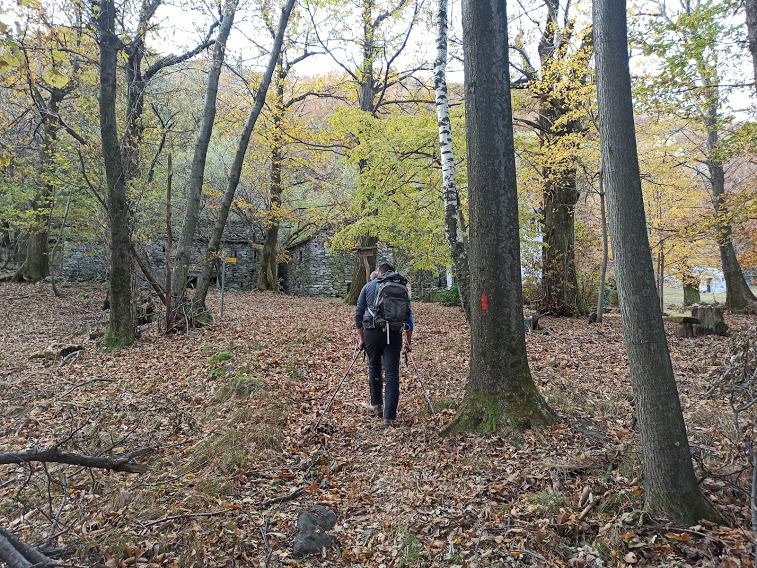 Di qui parte il sentiero che attraversa quasi subito un bellissimo bosco di faggi secolari. Così in basso? E’ vero che stiamo risalendo un versante nord, ma siamo a quota trecento e, pensandoci bene, non ne ricordo molti a queste quote. La guida anziana mi racconta che, nei secoli scorsi, le foglie erano una componente importante dell’economia montanara e contadina. E allora perché camminare tanto per trovare le bellissime foglie di faggio sopra i settecento metri? Meglio produrle dietro casa, piantando faggi a quote più basse. Con una felice intuizione, Paolo Crosa Lenz chiama questi boschi “fabbriche di foglie”. E così fu.