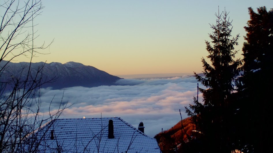 Dieci umani ed un quadrupede raggiungono Cheglio, frazione di Trarego. Scesi dalle auto (quota 771), ci accoglie subito uno stupendo scorcio del lago, coperto da un mare di nuvole. In alto c’è tantissima neve ed il bosco è avvolto in un candore surreale, da fiaba di Natale. Si attraversa Trarego e si inizia a salire. Pontetto, Alpe Fodrasca, dove calziamo le ciaspole a quota 900, alpe Schec (937). Fin qui c’è ancora poca neve, ma sopra quota 1000 ce n’è veramente tanta, fresca e pesante. Si comincia faticosamente a batter pista, soprattutto la guida ed un suo anziano assistente, tornato in piena forma.