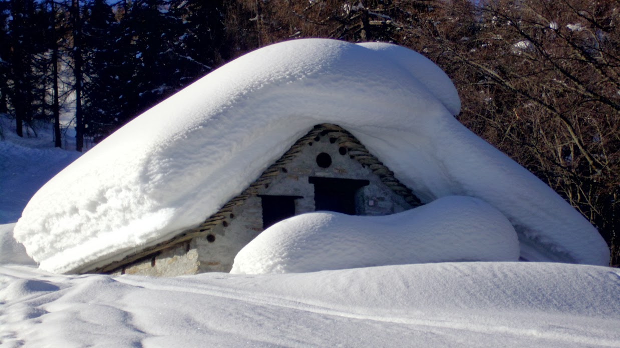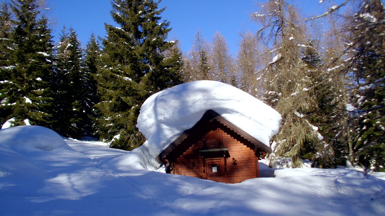 Per i ciaspolatori si tratta di ordinaria amministrazione e si godono tranquillamente, senza aver pagato il biglietto, lo spettacolo pirotecnico della gara di tuffi nella neve offerto dai poveri sciatori. Di solito con gli sci si torna a valle molto prima, ma oggi si arriva quasi insieme e le gambe degli sciatori tremano molto di più di quelle dei saggi con le ciaspole.