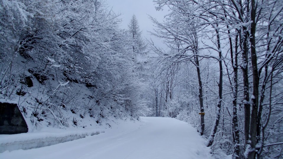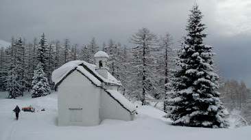 Con gli sci saliamo lungo i prati e, tanto per cambiare in questo nevoso inverno, battiamo pista. Una fascia di alberi tagliati nel bosco, sopra i prati, punta diritta all'ultimo tornante della strada, prima di San Bernardo, quota 1630, dove arriviamo tranquillamente in circa un'ora. Il piccolo parcheggio invernale, in prossimità della chiesetta, si raggiunge scendendo quasi in una buca: quanta neve quest'anno! Siamo sempre nella nebbia, con un po' di nevischio, ma la vista del potente fuori-strada della signora, che sale al rifugio insieme alla figlia per prepararci la pappa, ci toglie ogni perplessità. Arrivano i ciaspolatori, che han fatto molta più strada di noi, e si fa colazione.