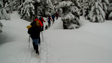 Riprendiamo lungo il percorso diretto per Gattascosa (destra orografica), senza scendere al ponte sul rio Rasiga. C'è sempre più neve fresca a terra, bagnata e pesante, mentre altra inizia a scendere dal cielo. I rami degli abeti sembrano cedere al suo peso. Proseguiamo, battendo sempre pista, fino allo splendido pianoro, da Rocky Mountains canadesi, cento metri sotto il lago di Ragozza. Adesso nevica forte, si vede sempre meno e le uniche tracce sono le nostre. Ci rendiamo conto che, in certe condizioni, ci si può perdere in montagna anche in luoghi dove si è già transitati mille volte. Qualcuno ha già fame. Strano! La decisione di tornare sui nostri passi non è particolarmente sofferta. Il profumo del buon cibo che ci aspetta al rifugio facilita il ritrovamento della pista di salita. Qualche bella curva in neve fresca, questa volta senza tuffi, ci riporta rapidamente al rifugio ed alla sua calda accoglienza.
