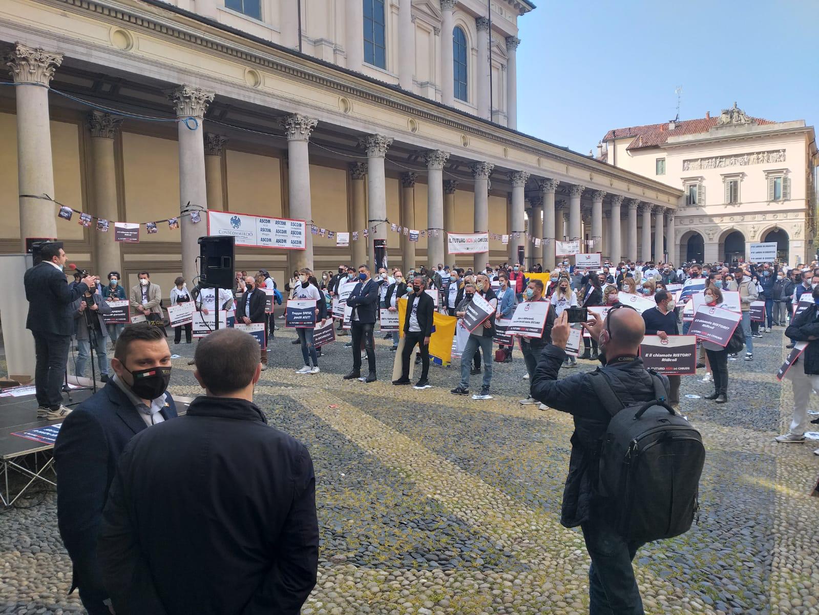 NOVARA - 01-04-2021 - Intensa partecipazione degli esercenti di VCO e Novarese che questa mattina si sono ritrovati in piazza Duomo (piazza della Repubblica) a Novara, per la manifestazione organizzata da Confcommercio Alto Piemonte contro le chiusure dei pubblici esercizi.
