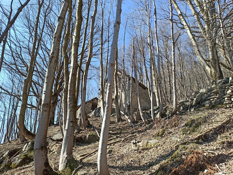 Proseguiamo sulla strada fino a quota 670, dove, sulla sinistra e sotto la strada, parte il sentiero per l’Alpe Termine. Qui giace un palo metallico da cui il vandalo di turno ha divelto scientificamente tutti i cartelli indicatori, compreso quello per la nostra meta. Il sentiero è evidente e segnato, a tratti sporco e abbastanza faticoso, anche grazie al caldo odierno piuttosto imprevisto. Camminiamo adesso in direzione sud ovest.