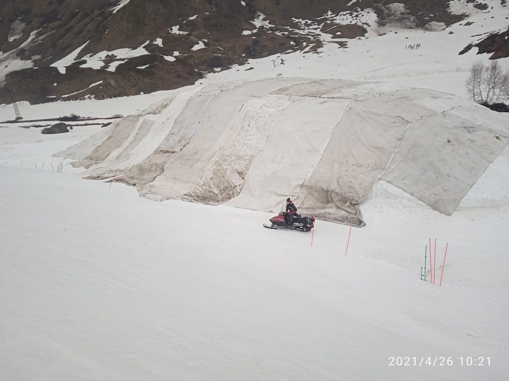 I 6000 metri cubi di neve sono stati coperti da tecnologici teli geotermici con fibre di alluminio, intervallati da strati isolanti di ovatta grazie al supporto tecnico di Snow Makers, un’azienda specializzata svizzera. I teli sono poi stati legati uno all’altro con un sistema di velcri e cuciture a filo. Questi speciali materiali di copertura garantiscono il doppio beneficio di proteggere termicamente la massa sottostante e, grazie all’azione riflettente, di non far penetrare i raggi UVA. La neve resterà impacchettata sotto i teli per tutta la stagione estiva e sarà posata in autunno. Secondo le stime, al netto di una parte di “oro bianco” che andrà probabilmente persa, la neve stoccata servirà a coprire circa 2 km e mezzo dell’anello della pista di fondo di Riale (complessivamente lunga oltre 12 km), permettendo una prima attività sportiva anche in assenza di nevicate e senza ricorrere a cannoni sparaneve e quindi all’utilizzo eccessivo di energia elettrica e acqua.