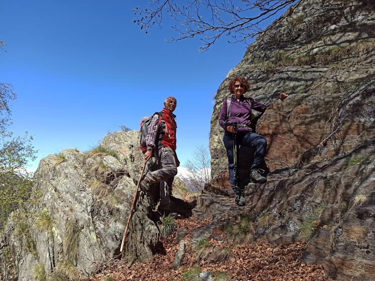 La sacra regola del saper rinunciare, che ci ha permesso di superare i sessanta e anche i settant'anni, viene applicata senza esitazione. Se ne riparlerà fra un mese. Il vano tentativo ci ha portato via mezz'ora. Le incisioni rupestri di Sassoledo, che sono lì forse da millenni, possono aspettare ancora qualche settimana. Dopo la lunga e tranquilla pausa pranzo a Roi iniziamo la discesa lungo il percorso di salita. Passiamo da L'Erta e, a quota 850, incontriamo un bivio con un sentiero evidente a sinistra, anche questo indicato sulla cartina come “non segnalato”, che dovrebbe portare direttamente a Verigo, attraversando il Margologio più in alto di stamattina. Purtroppo, dopo un quarto d'ora, scompare nel nulla.