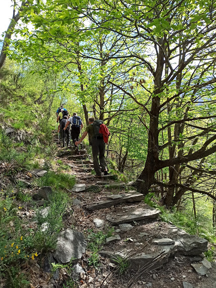 Di qui il sentiero ben segnato scende ad attraversare sul Ponte del Diavolo, 600, la profonda forra del torrente Isorno, uno dei tanti paradisi del canyoning presenti nelle valli ossolane. Oltre il ponte si comincia a salire subito in presa diretta. Del resto il dislivello perso lo si deve pur recuperare in qualche modo. Il sentiero è sempre evidente e, a quota 820, raggiungiamo le prime baite di Aulogna. In questo bosco ci sono degli spettacolari castagni ultracentenari, uno dei quali forma alla base un'ampia galleria che può fare da cornice naturale ed abbellimento ad anziani che si vogliono far fotografare. Ci teniamo a destra e, sempre in presa diretta, saliamo a quota 924, dove la condotta forzata quasi orizzontale proveniente da Cippata si tuffa verso il fondovalle.