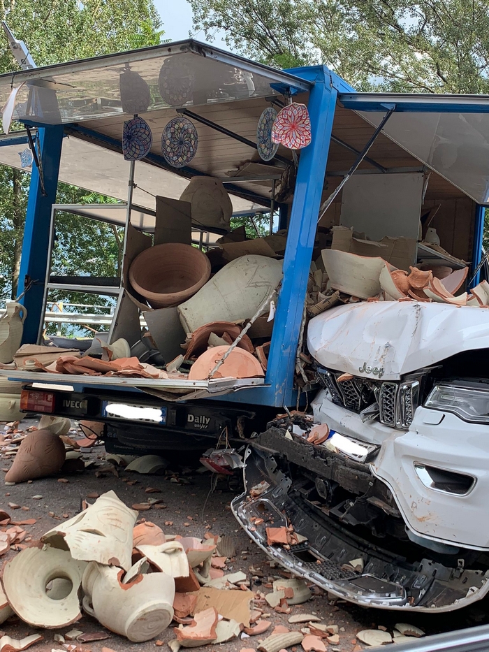 GHIFFA - 16-07-2021 -- Un veicolo semidistrutto e cocci dappertutto. È questo il bilancio dell’incidente stradale accaduto verso le 19 di oggi sulla statale 34 del Lago Maggiore, tra Ghiffa e Oggebbio. A bordo strada, lato lago, era posteggiato il camion di un venditore ambulante di vasi la cui merce era in parte esposta nel piazzale/parcheggio, al di fuori della carreggiata. Proveniente da Verbania e diretta a Cannobio è sopraggiunta una Jeep di un automobilista tedesco che, sorprendentemente, ha centrato lo spigolo posteriore destro del camion. Nell’impatto il suv ha riportato ingenti danni, non di meno li ha patiti l’ambulante, che ha visto andare in frantumi decine di vasi. Il sinistro è stato rilevato dai carabinieri.