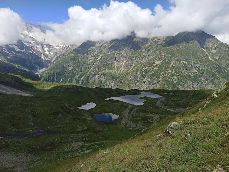 Qui ci raccordiamo con il sentiero SFT (Simplon Fletschhorn Trekking). Le indicazioni sono sempre evidenti e, dopo una breve pausa, passando vicino a dei ruderi di baite, saliamo al pianoro superiore, dove si trovano i quattro laghetti di Pontimia, 2249. L’ultimo strappo ci porta al Passo, 2385 (quaranta minuti dall’Alpe). Siamo sul confine con la nostra patria. Dominiamo la Val Bognanco e laggiù ad oriente vediamo anche una piccola parte di Domodossola. Solo lo Straciugo, il top della valle, pur essendo vicinissimo, ci viene negato dalle nuvole. Nonostante un fresco venticello e poco sole, ci fermiamo qui abbarbicati per il pranzo. Ridiscendiamo all’Alpe e optiamo per il ritorno un po’ più lungo.
