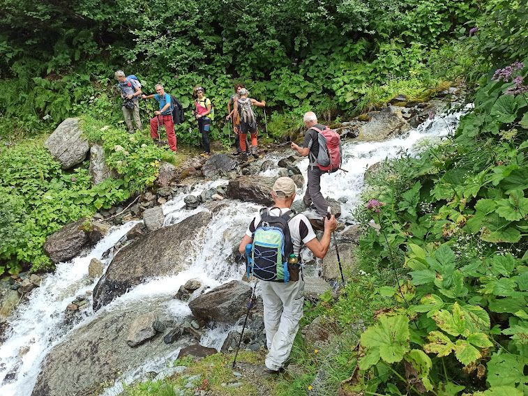 Da Gondo saliamo nella Valle di Zwischbergen, a Bord, poco oltre il bacino di Sera. Parcheggiamo nel solito grande spiazzo sulla riva del torrente Grosses Wasser, a quota 1300 circa. Pensando agli oltre quaranta gradi del nostro Sud, ci gustiamo i dieci gradi di questa valle ancora in ombra. Ci dirigiamo a meridione in dolcissima salita sulla strada asfaltata fino al fabbricato di una centrale idroelettrica. Sullo sterrato arriviamo a Tannuwald, 1420, e attraversiamo il torrente, passando sulla destra orografica con la sua bella mulattiera. Siamo sui sentieri TPA (Tour del Pizzo Andolla). La strada sterrata resta sulla sinistra orografica. Prima del bacino idroelettrico di Fah, 1761, riattraversiamo il torrente e, lungo la strada, oltrepassiamo il lago.