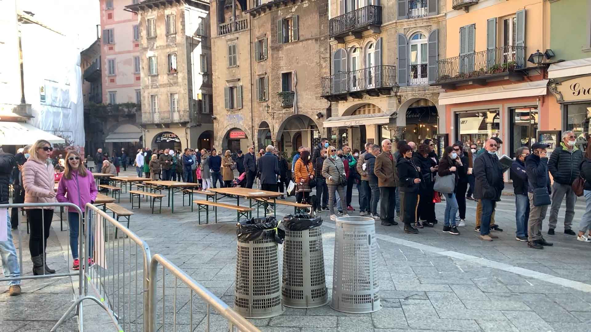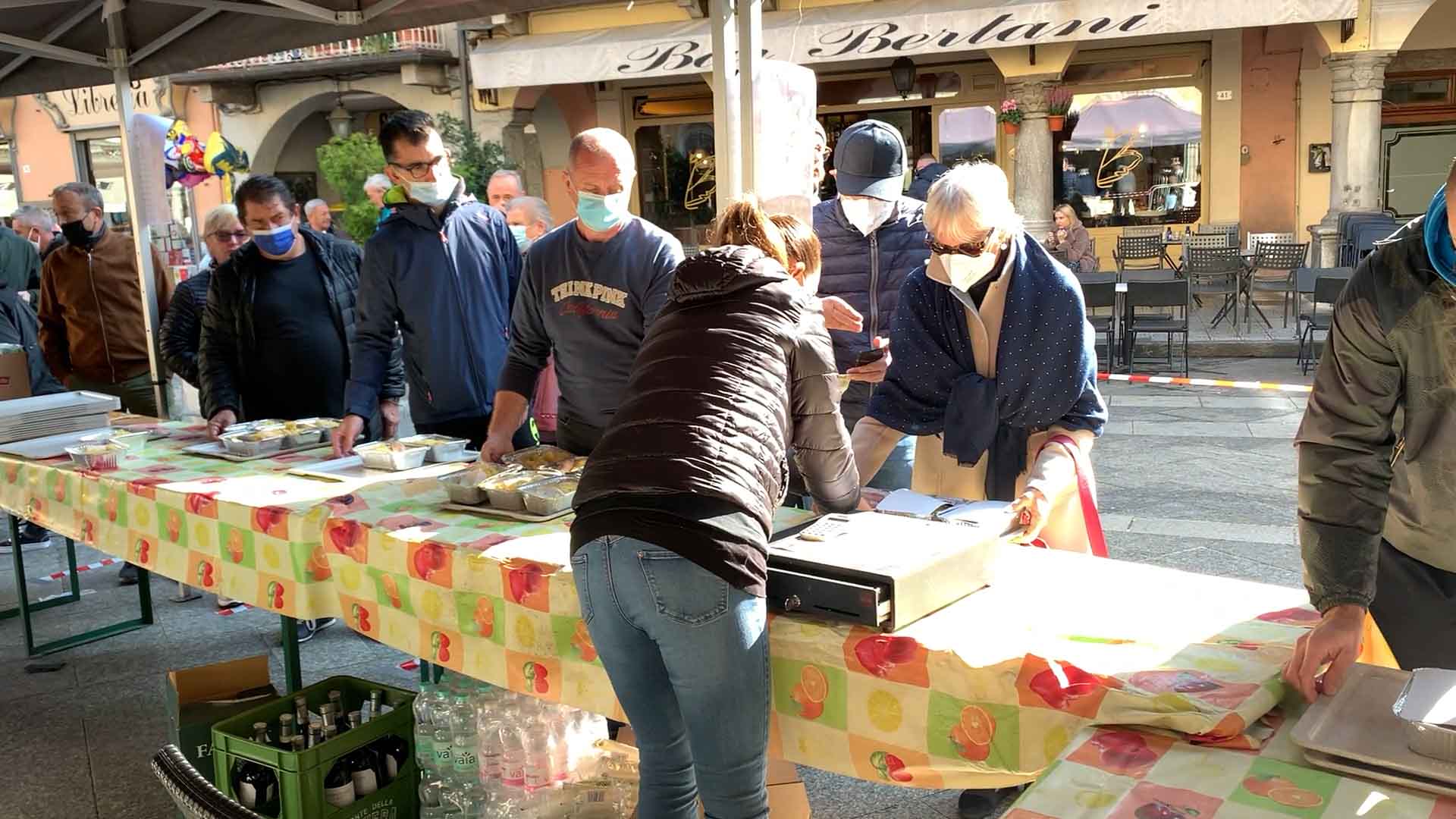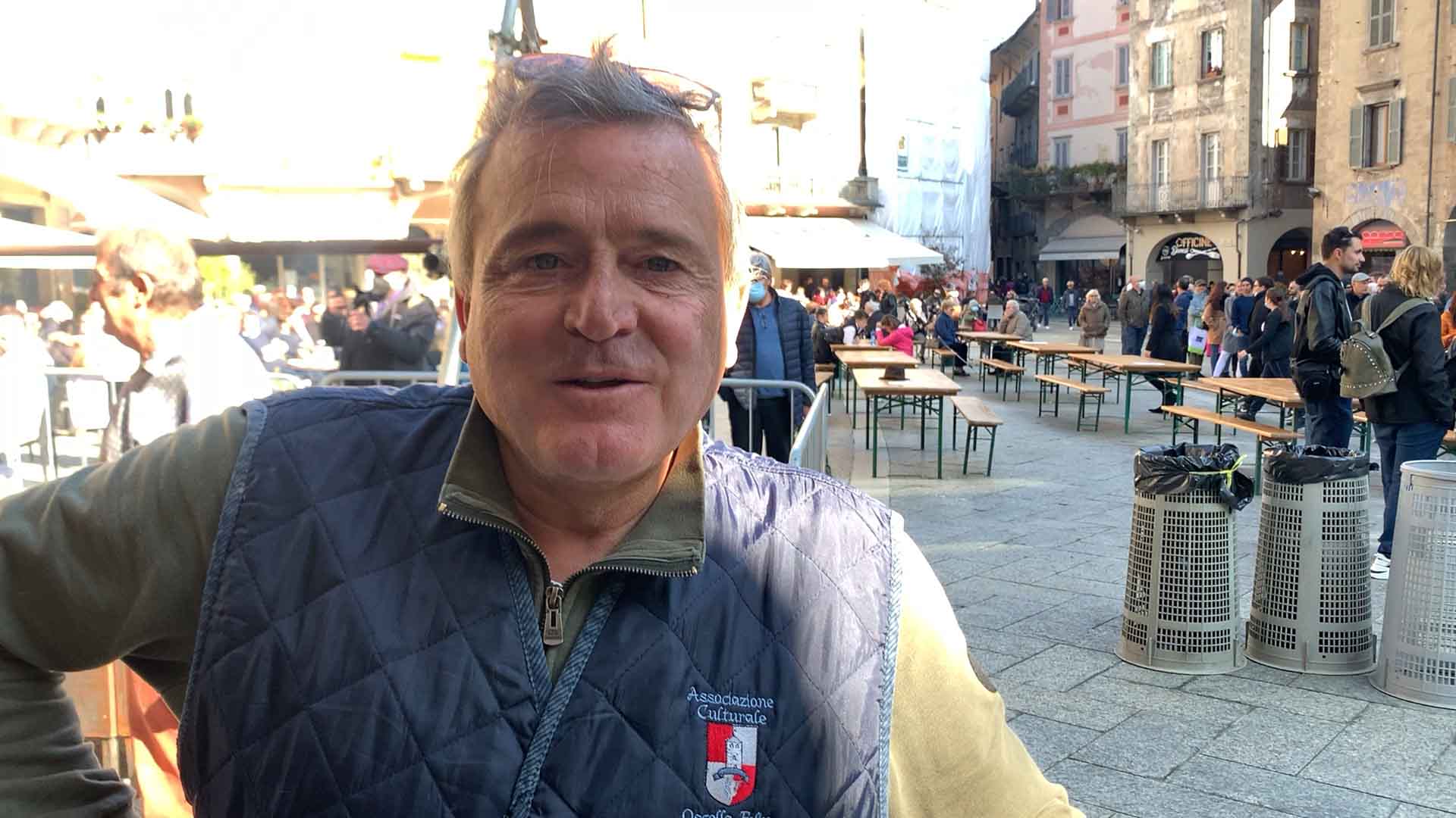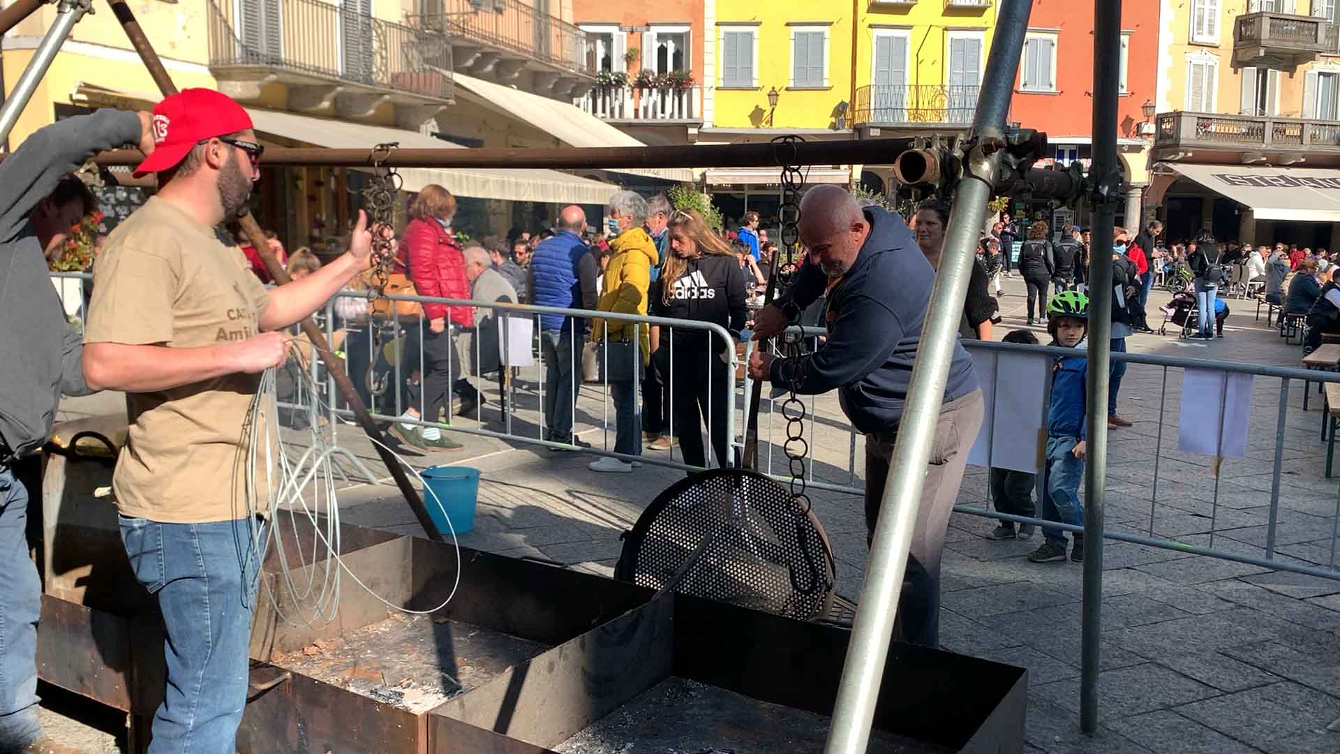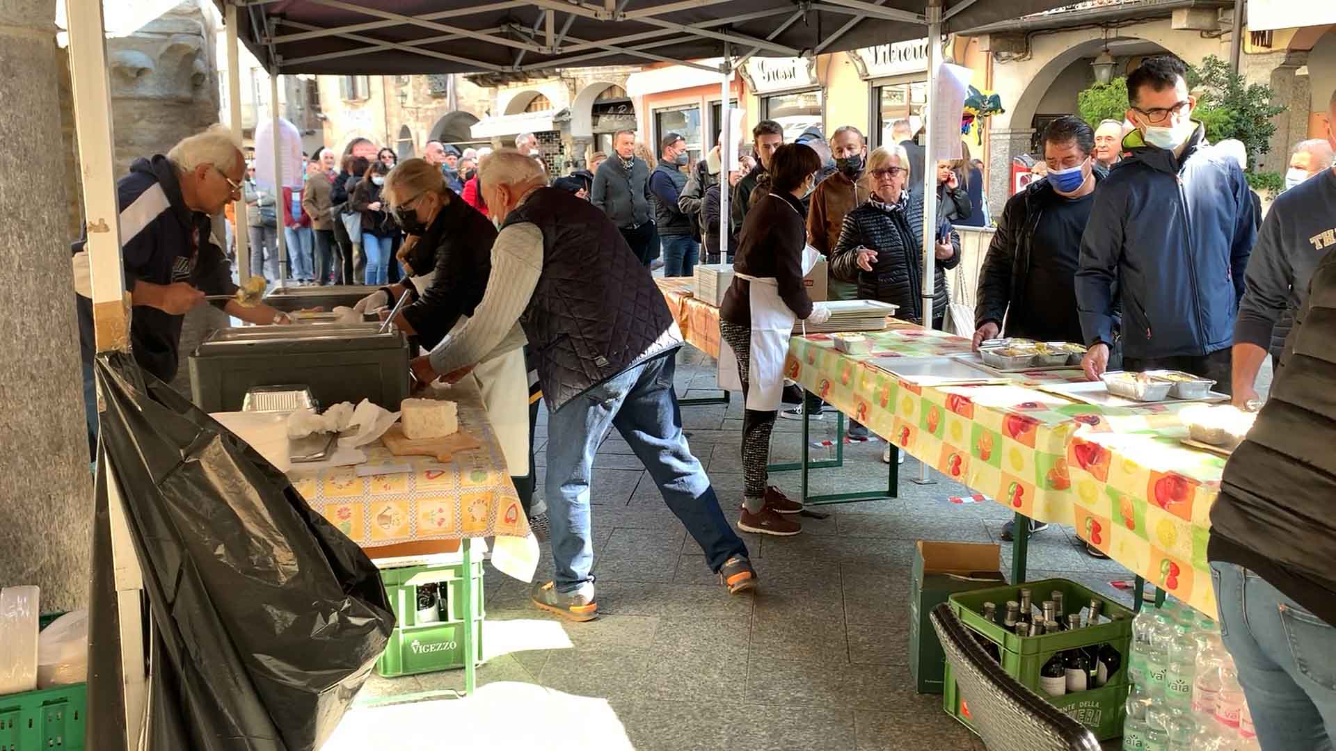 DOMODOSSOLA-43-10-2021-- Tanta voglia di normalità e socialità a Domodossola come dimostra la grande affluenza alla Festa d'Autunno in programma per tutta la domenica su iniziativa dell'associazione Oscella Felix. In tantissimi in piazza Mercato per la distribuzione di polenta e spezzatino, salamini e gorgonzola. Dalle 14 si potranno degustare gli stinchett, ed alle 15 le castagne con il vin brulè.