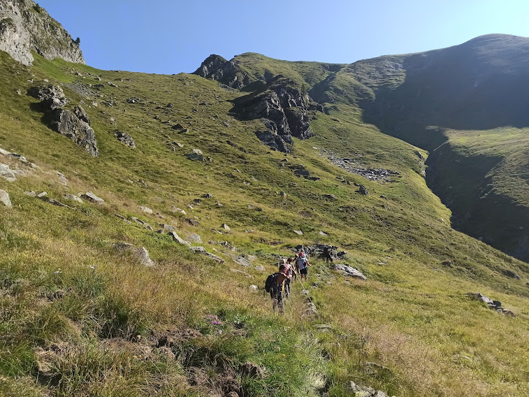 Ora siamo su tracce o presunte tali. Né le cartine né i sentieri sono più quelli di una volta. Poco più in alto ci concediamo una breve pausa. Sempre diretti ad oriente continuiamo ad attraversare verdi prati in dolce ascesa fino ad arrivare in prossimità del Passo del Forneto. Qui viriamo gradatamente a sud e ci abbassiamo di qualche decina di metri lungo un tratto di sentiero ripido e impervio, ma non esposto come l’antipatico traverso dopo Cavallo di Ro. Dall’alto ci osservano degli stambecchi, che un esperto cacciatore battezza subito “capre” (ma ci arriviamo anche noi) al suono dei loro campanacci. Cerchiamo di tenerci alti, sempre navigando a vista, fino a che non incrociamo una vaga traccia, che dovrebbe essere il sentiero C20.