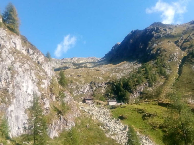 Più in alto si congiunge con il sentiero B20 che parte dal centro di Vanzone. Proseguiamo, con rari tratti che danno respiro, e, in meno di un’ora, arriviamo a Pianezzo, 1172. Abbiamo offerto l’onore di “fare il passo” all’anziano maestro di sci taroccato che lamenta sempre malanni e scarso allenamento, sebbene cammini due o tre volte alla settimana. Sperando così in una giornata riposante, abbiamo una cocente delusione perché la guida non ci darà tregua per tutta la salita. Riusciamo ad imporgli una breve pausa colazione all’Alpe Briga, 1335, che raggiungiamo dopo mezz’ora di bel sentiero nel bosco.