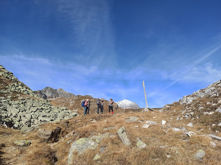 Che meraviglia! Finalmente una pausa seria (sette – otto minuti)! Non proseguiamo verso il passo e viriamo subito a sinistra lungo una traccia che sale dolcemente, restando sul versante della Val Cairasca. Dopo pochi minuti viriamo a sinistra (sud) e un breve strappo lungo il sentiero F32a, che sale dall’Alpe I Pianezzoni, ci porta al Passo dei Gialit (2250 circa) (venti minuti).. Siamo sulla cresta che separa Val Cairasca e Val Divedro. Questo è il punto più alto dell’escursione odierna.