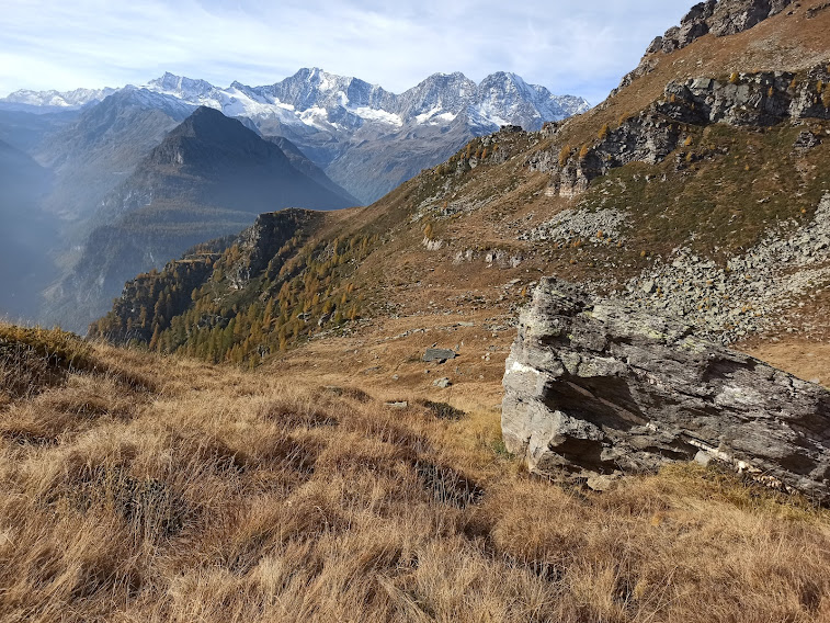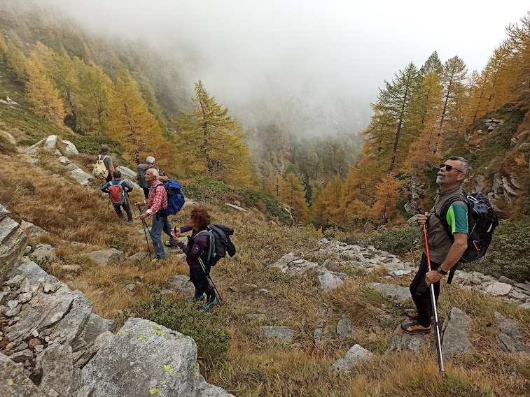 Una volta gli alpeggi erano molto più vivi di adesso e le strade non c’erano. O mi confondo? La pista sale in direzione dell’Alpe Lavazza, ma sicuramente non si fermerà lì: finché c’è salita c’è speranza! Torniamo ad immergerci nei colori dell’autunno lungo il sentiero evidente e piuttosto ripido, ad alto rendimento. Cominciano a farsi vedere l’Andolla, il Fletschorn, i quattromila del Sempione, lo smog a fondovalle. E per tutto il giorno attraverseremo boschi di larici spettacolari. Passiamo dall’Alpe Casalavera, 1549, e dall’Alpe Orzalina, 1696.