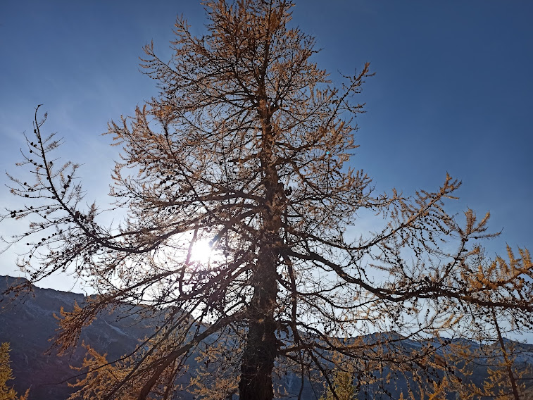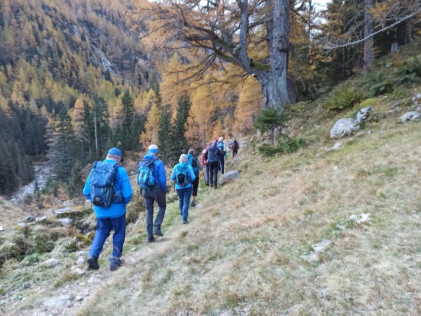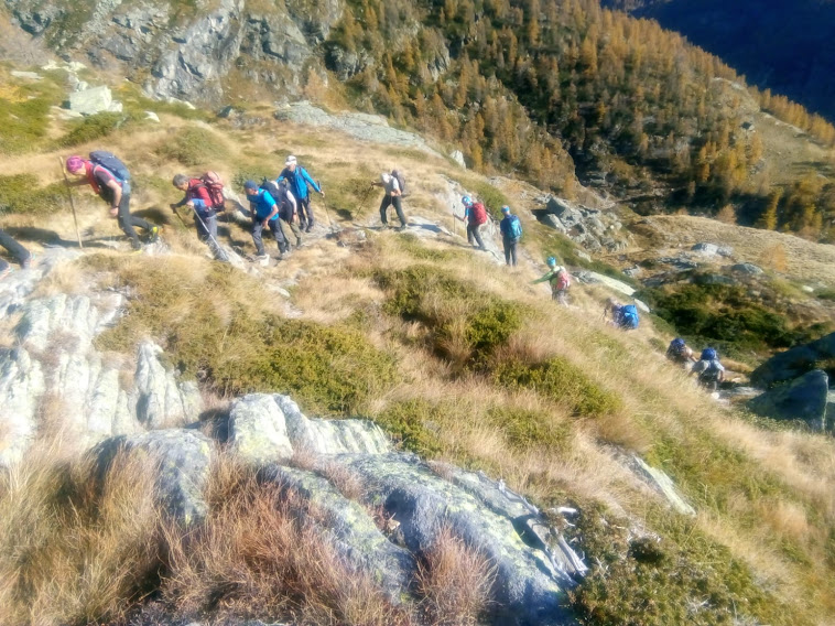 Ci ricompattiamo ed iniziamo la salita “seria”, diretti adesso a nord ovest, incontrando, poco più in alto, il caldo sole di questa magnifica giornata autunnale. Siamo immersi nel colore dorato di vecchi larici che il poeta della montagna Paolo Crosa Lenz chiama “signori dell’autunno”.